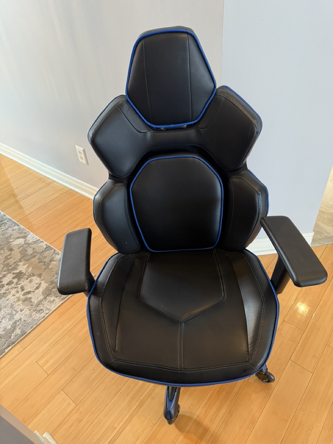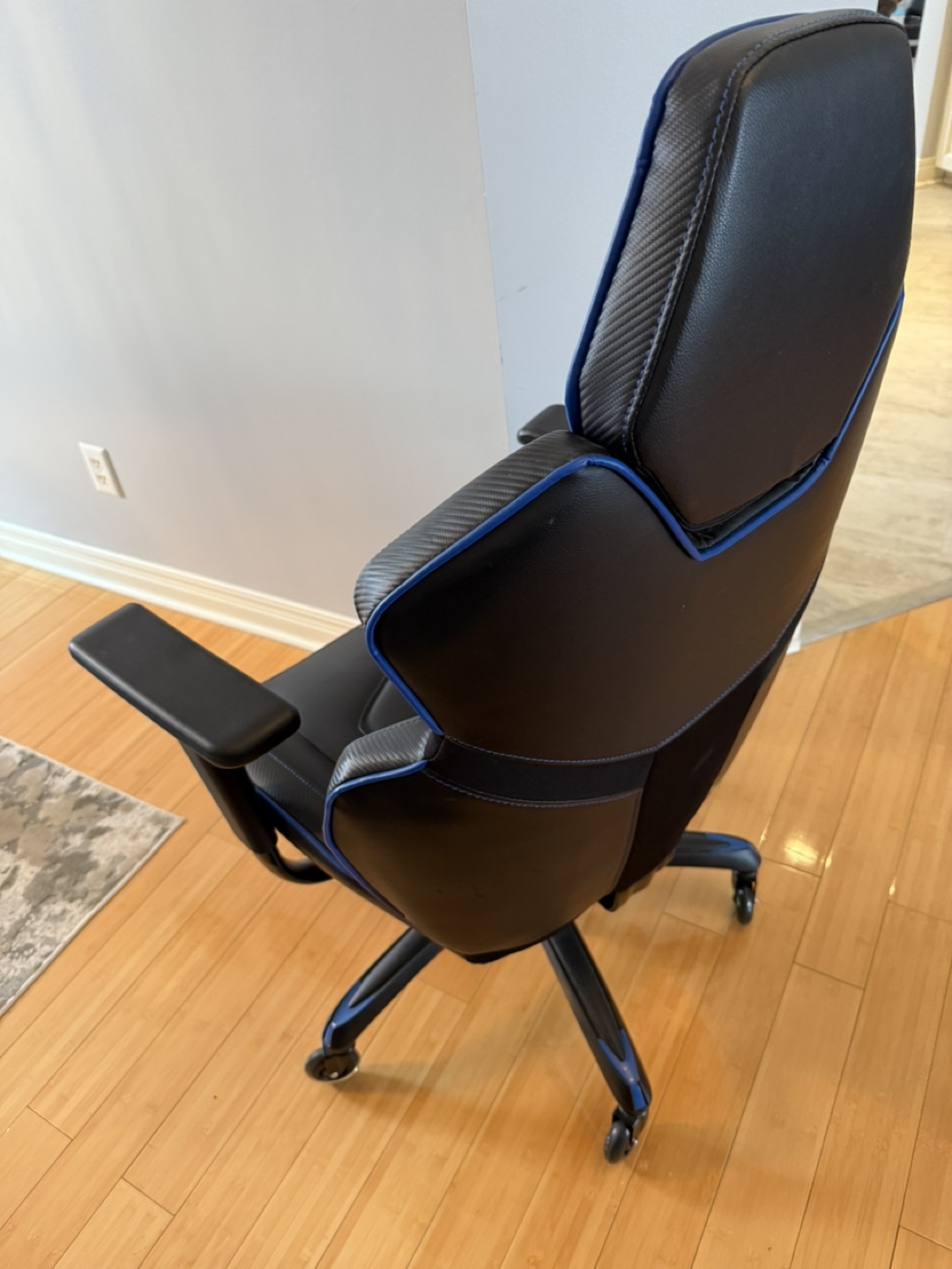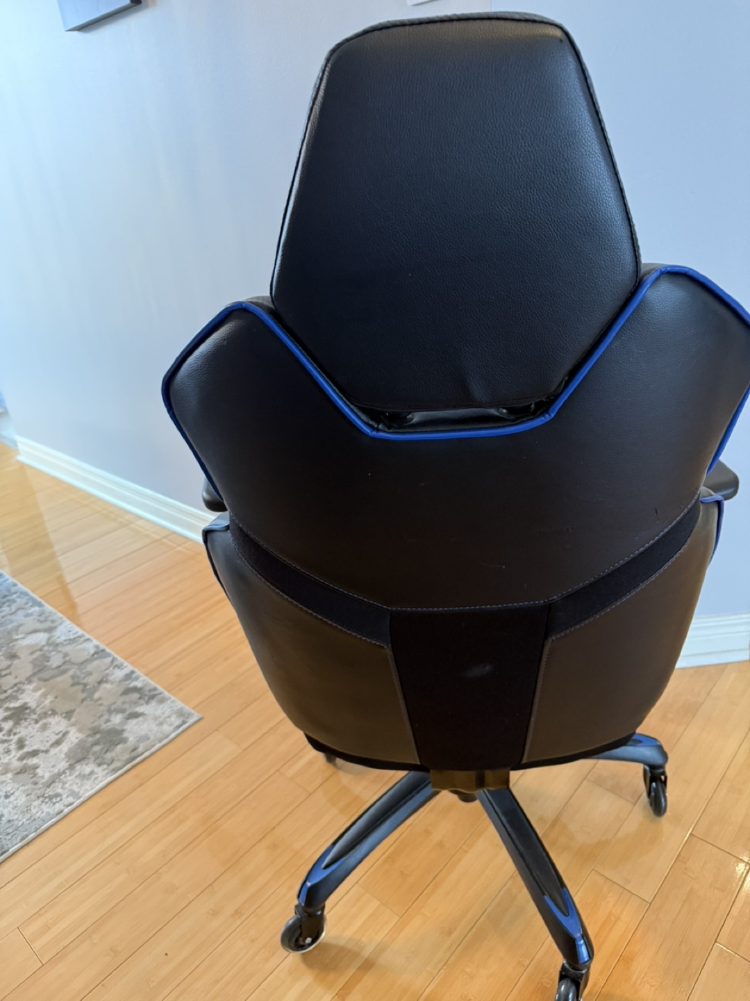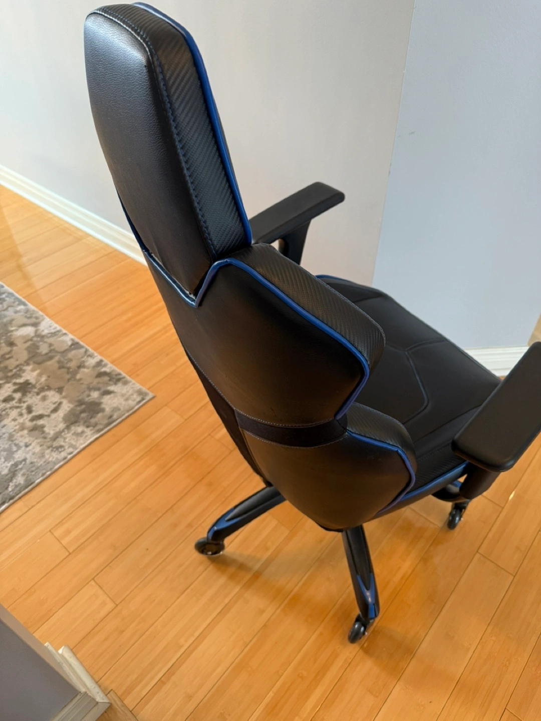 Comfortable gaming chair. Black faux leather with blue accents. Adjustable. Five-star base with rolling casters. Excellent for long gaming sessions or home office use.