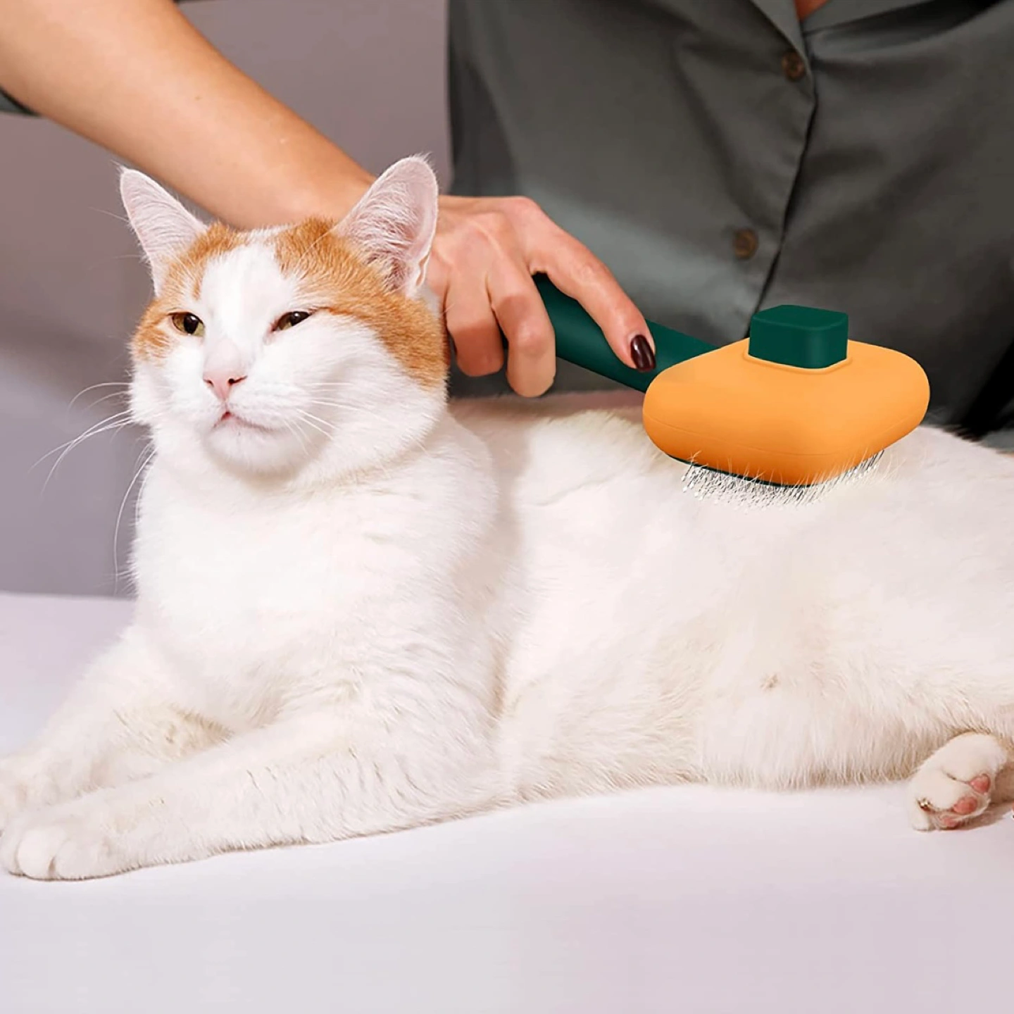 One Button to Slide off Hair - The brush at a 135Β° tilt angle can help you collect the cat hair and by just clicking the button, you can easily remove the hair from the brush. No more cleaning tasks after grooming.