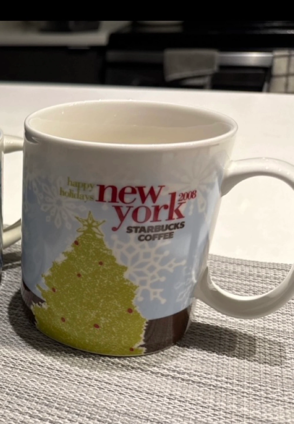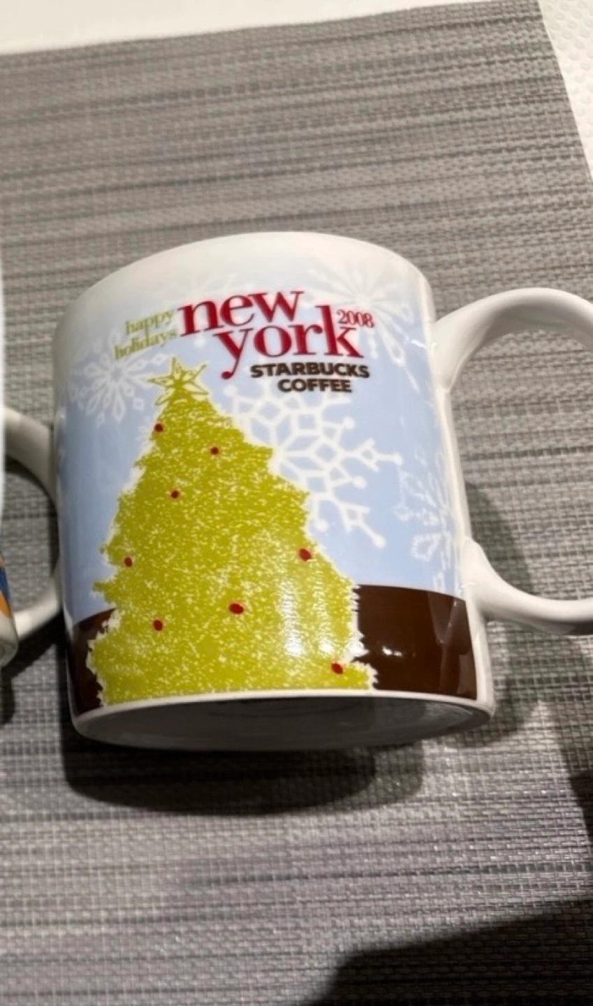Two Starbucks coffee mugs. 2008 Holiday edition. New York City theme. One features a Christmas tree, the other features ice skaters. Excellent condition.