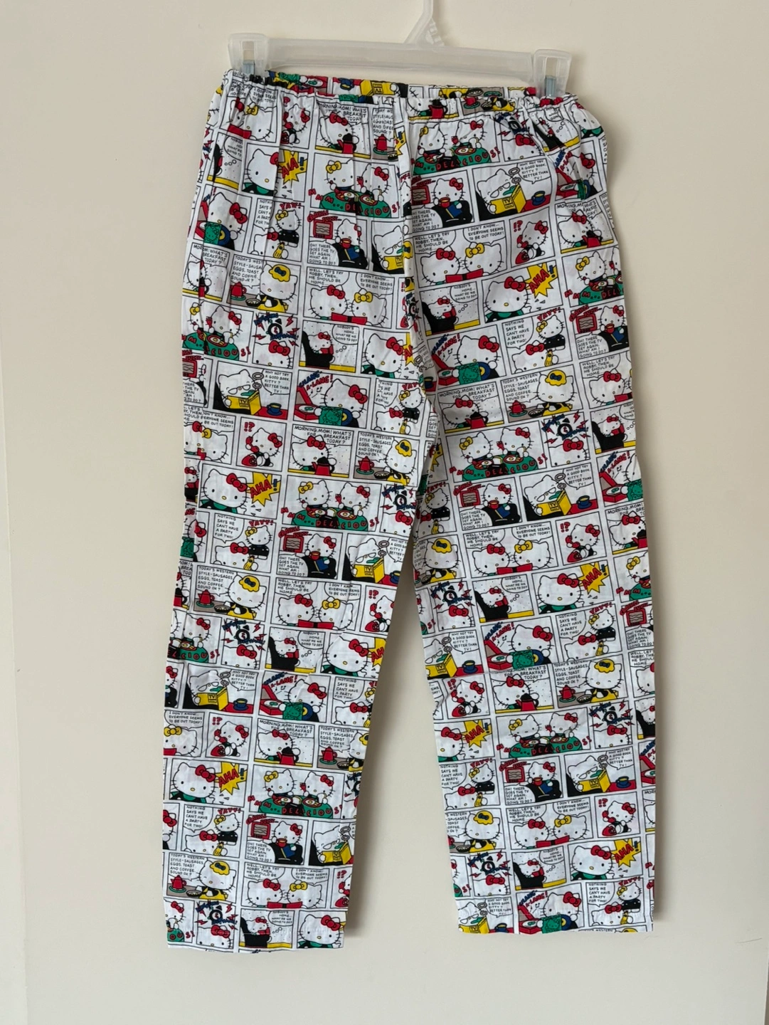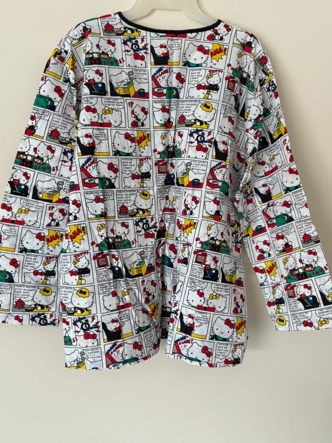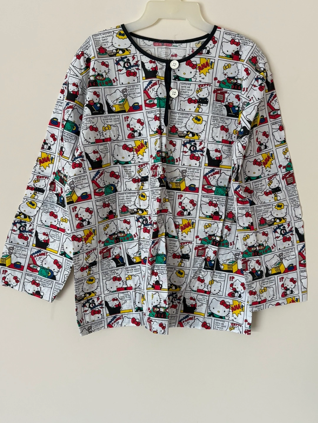 Adorable Hello Kitty pajama set. Features a long-sleeved top with button closure and coordinating pants. Comic strip print throughout. Perfect for lounging. New and never worn.