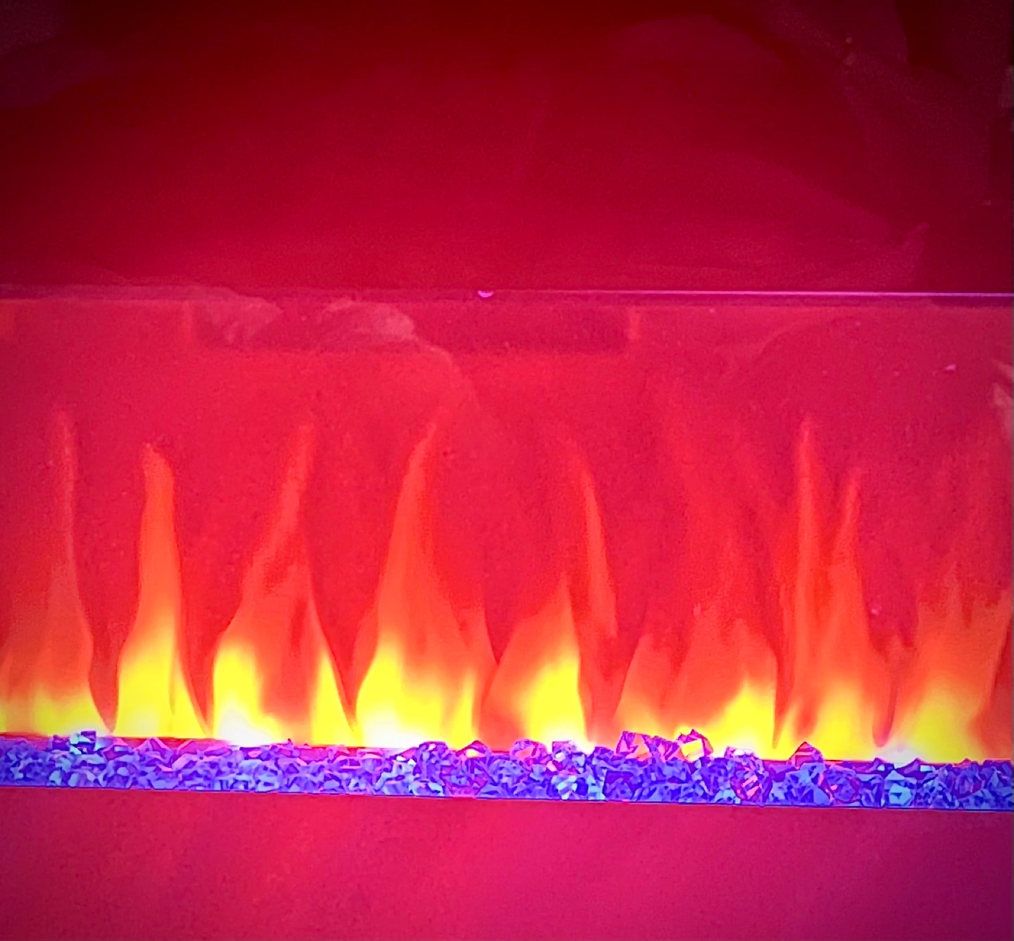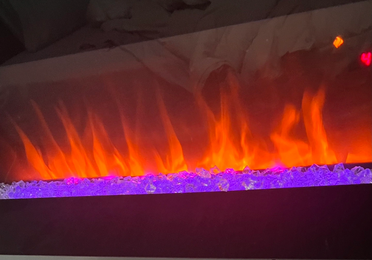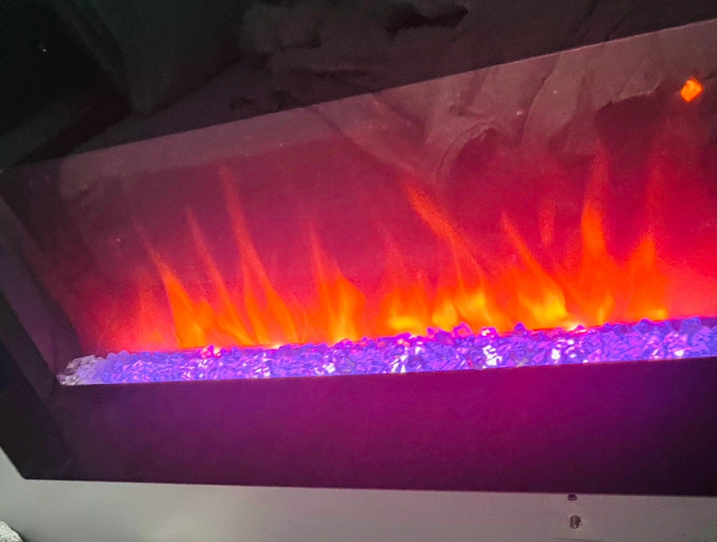 Wall mounted electric fireplace. Realistic flame effect. Purple ember bed. Excellent condition.