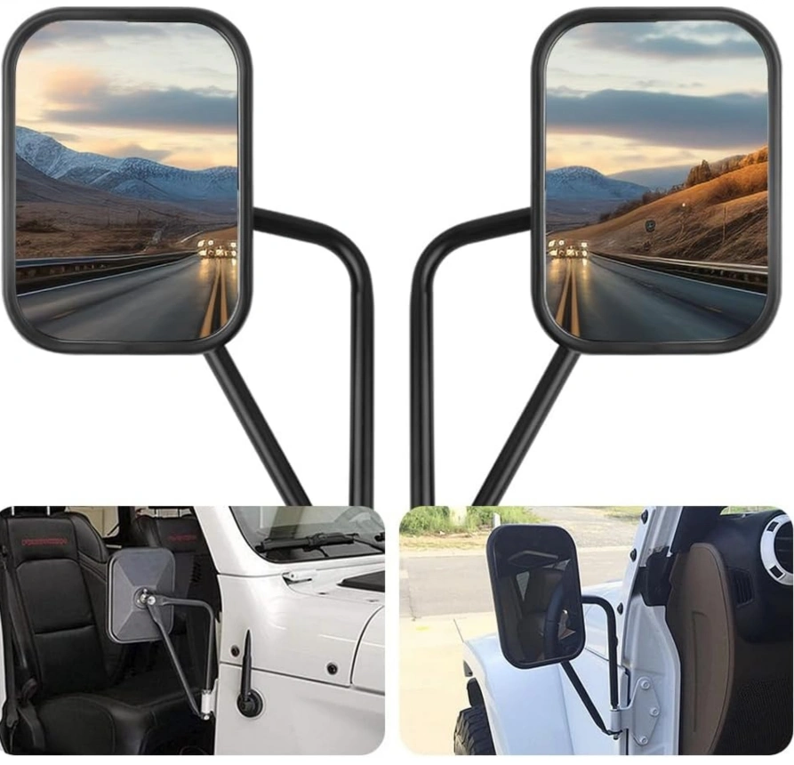 Pair of black convex side mirrors. Adjustable arms. Fits various Jeep Wrangler models. Durable construction. Enhance visibility driving with your doors off.