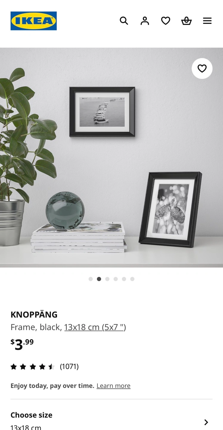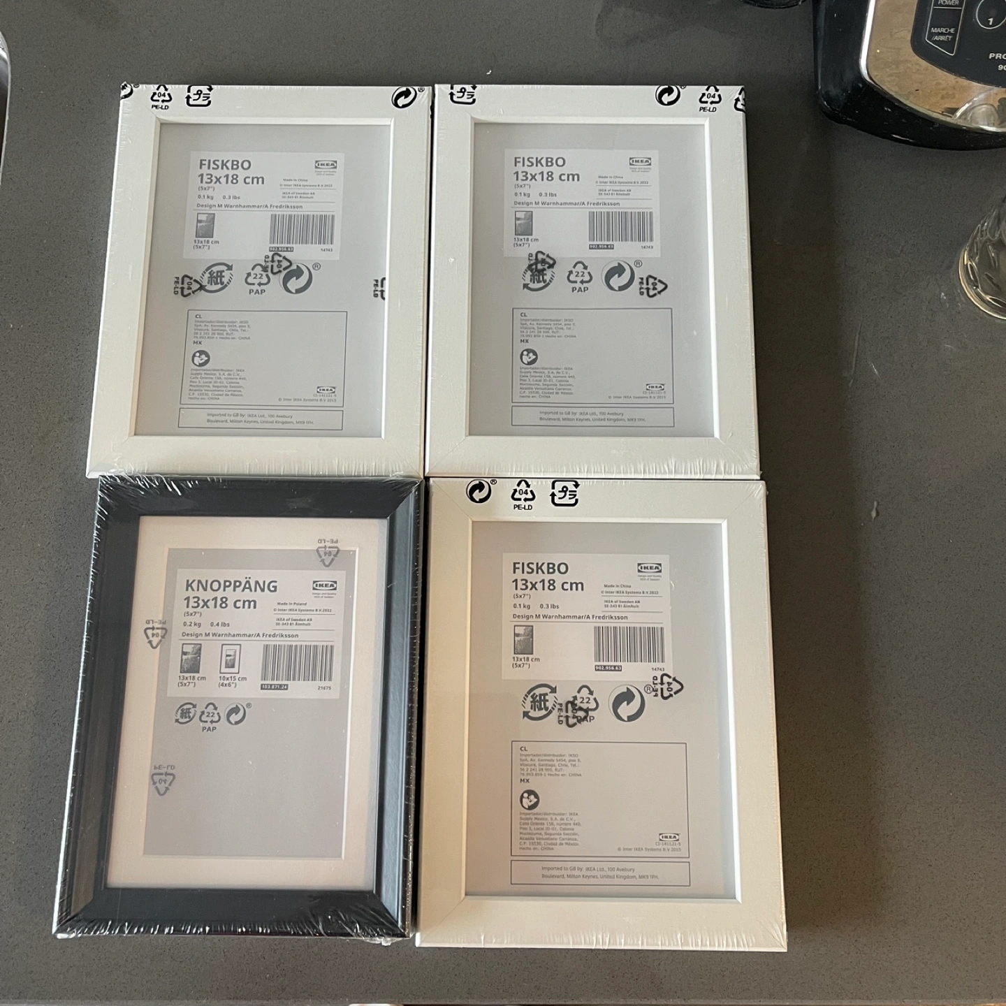 Set of IKEA picture frames. Includes both white FISKBO and black KNOPPANG frames. 13x18 cm size. New in packaging.