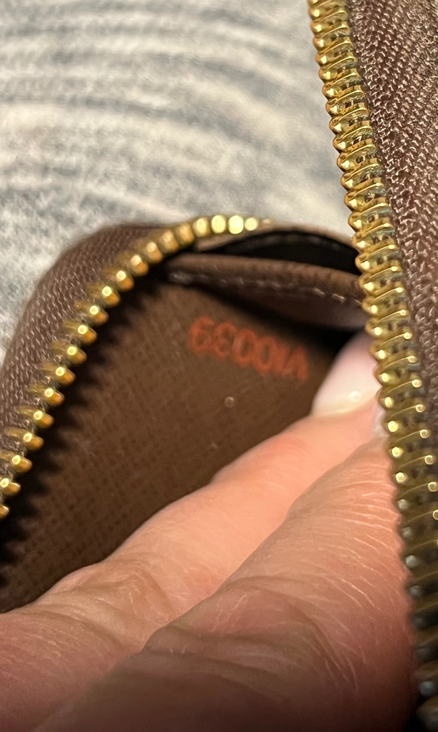 Pre-owned Louis Vuitton wallet. Damier Ebene canvas. Goldtone hardware. Zip closure. Several card slots and compartments.