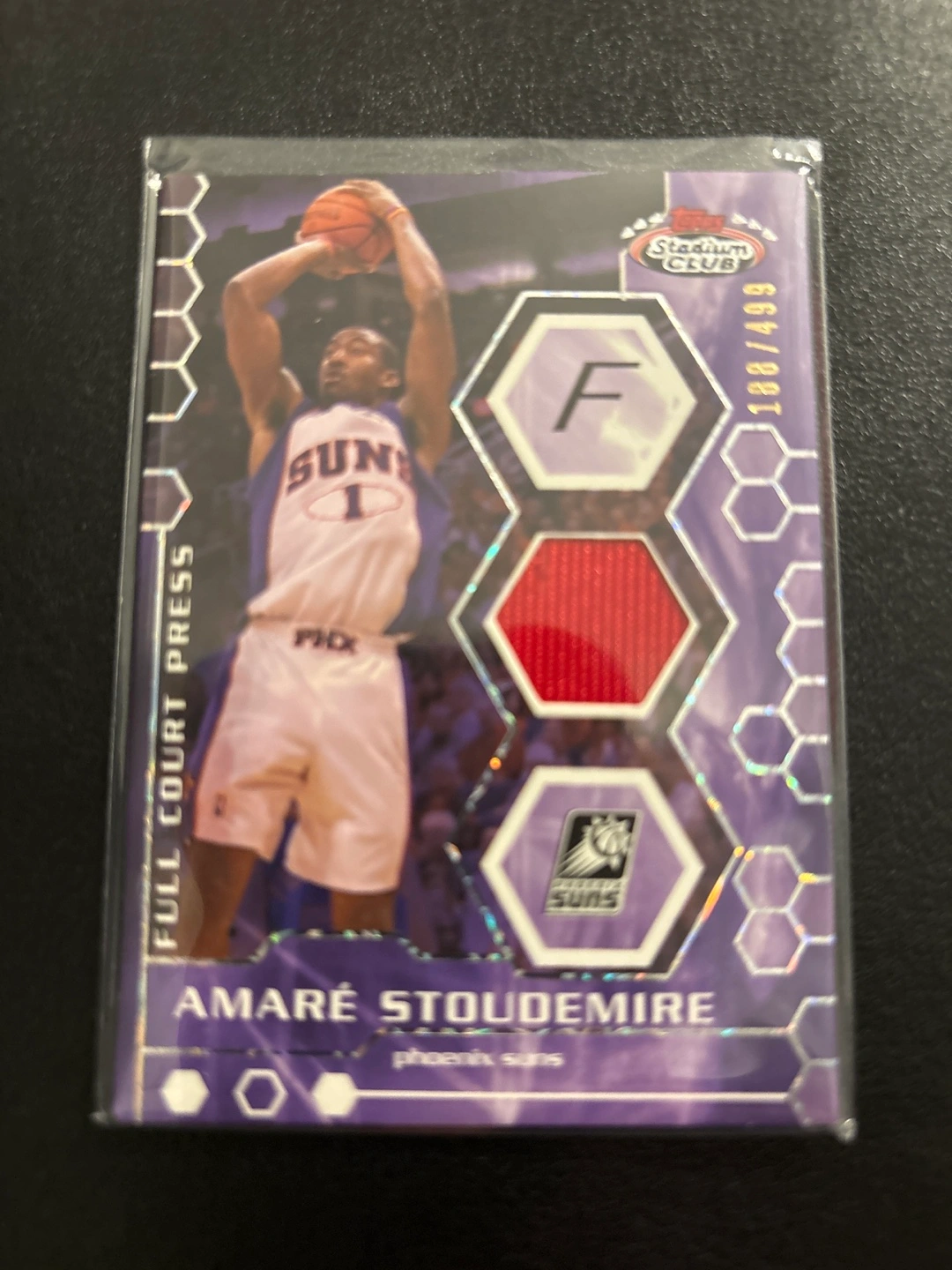 Rare Amare Stoudemire relic card. 2007-08 Topps Stadium Club Basketball. Full Court Press. Numbered to 499. Features a piece of his jersey.