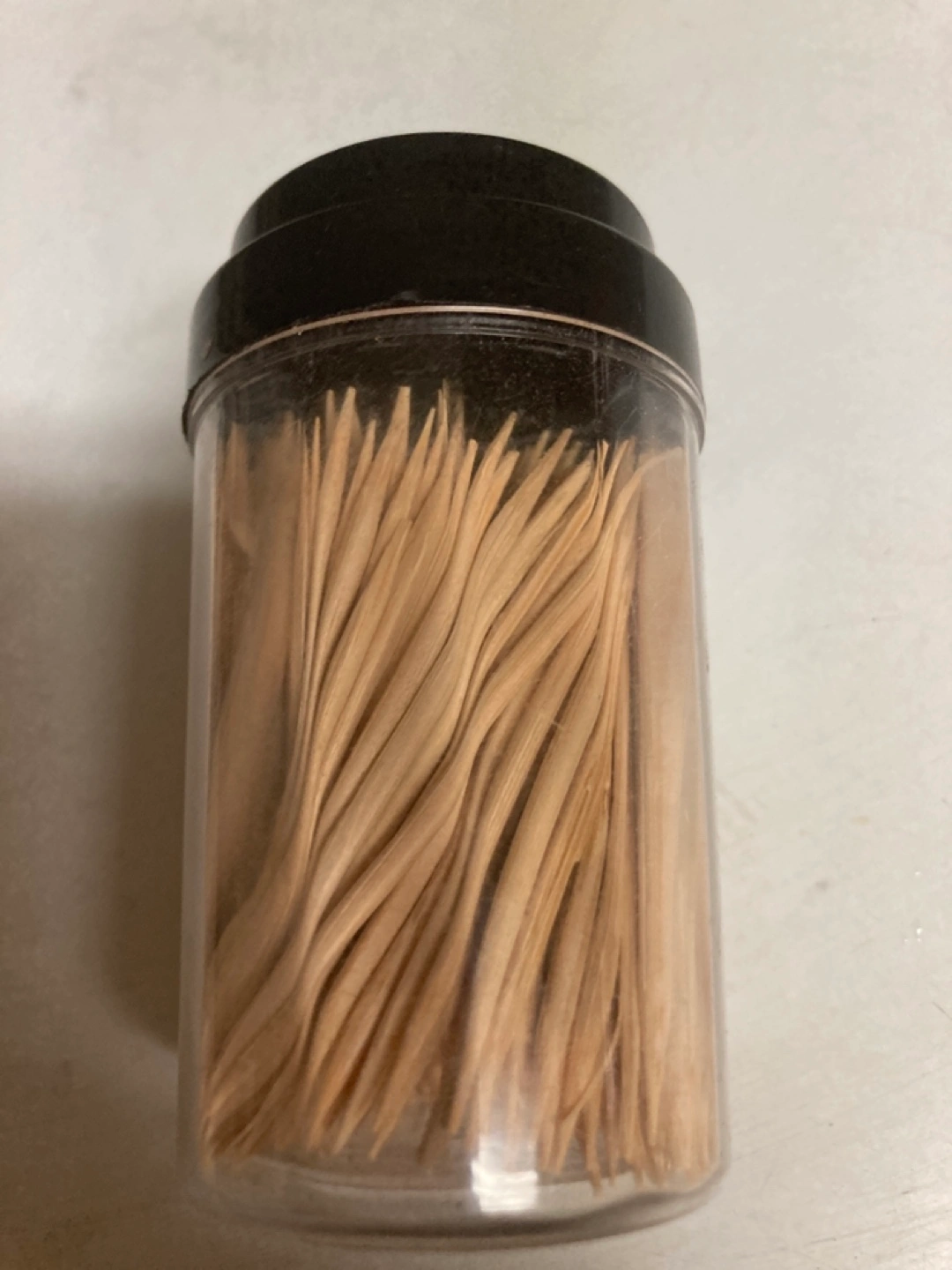 Clear plastic container filled with toothpicks. Black plastic lid with dispenser. Small and convenient.