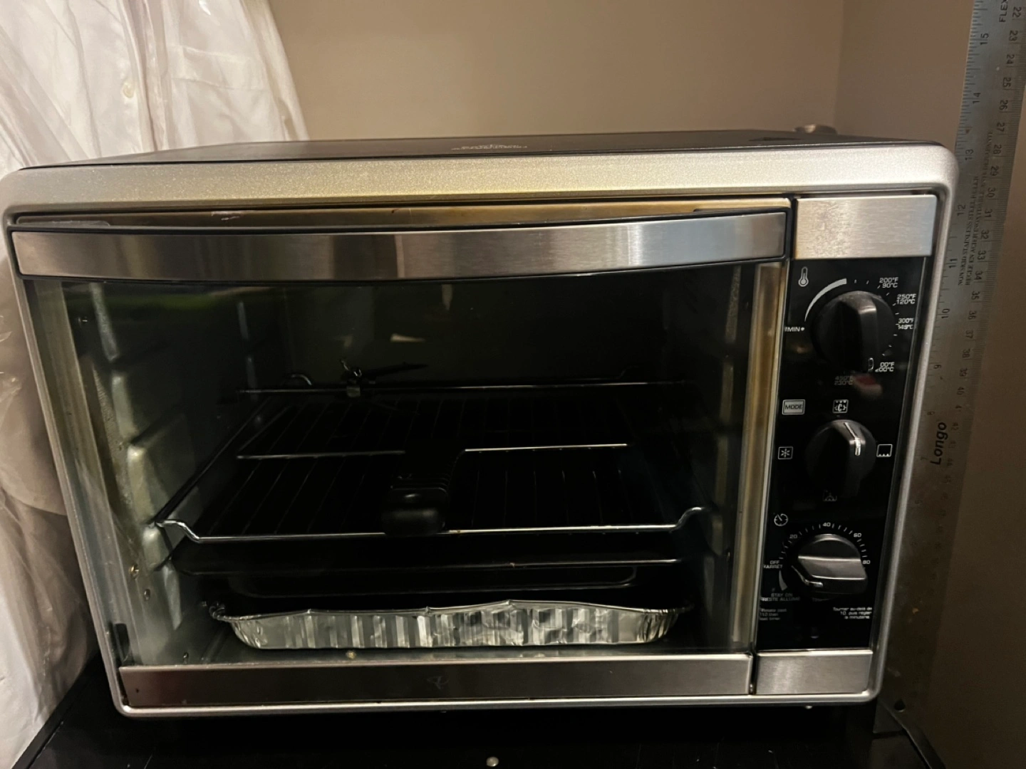 Stainless steel countertop oven. Includes baking pan and wire rack. Good for small spaces. Simple controls. 13.5” tall & 17.5” long included is drip tray , rotisserie stick plus more.