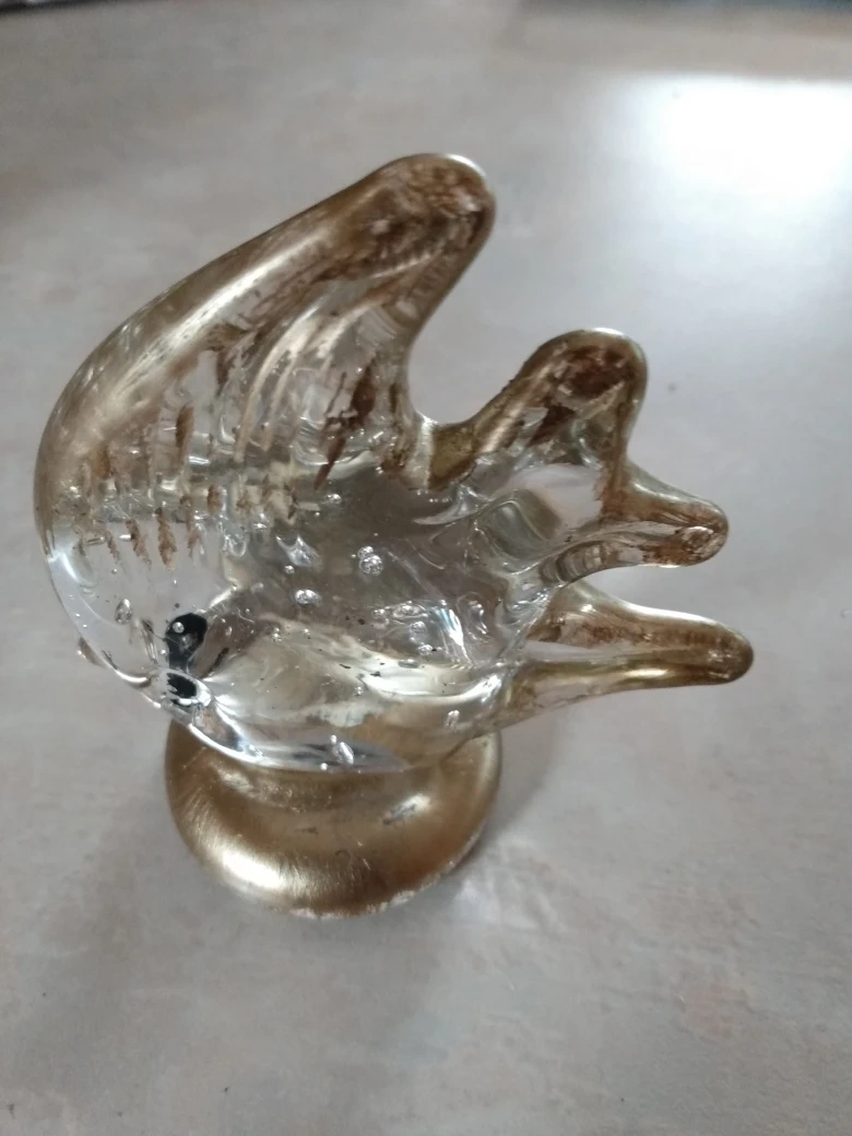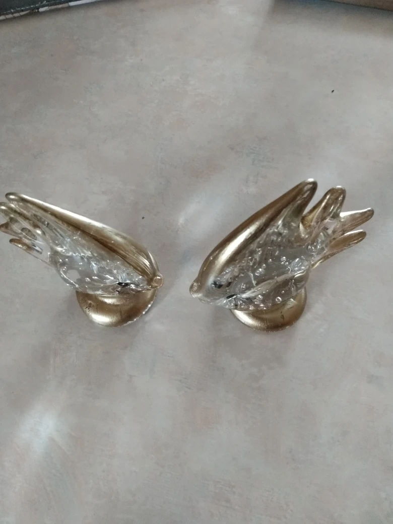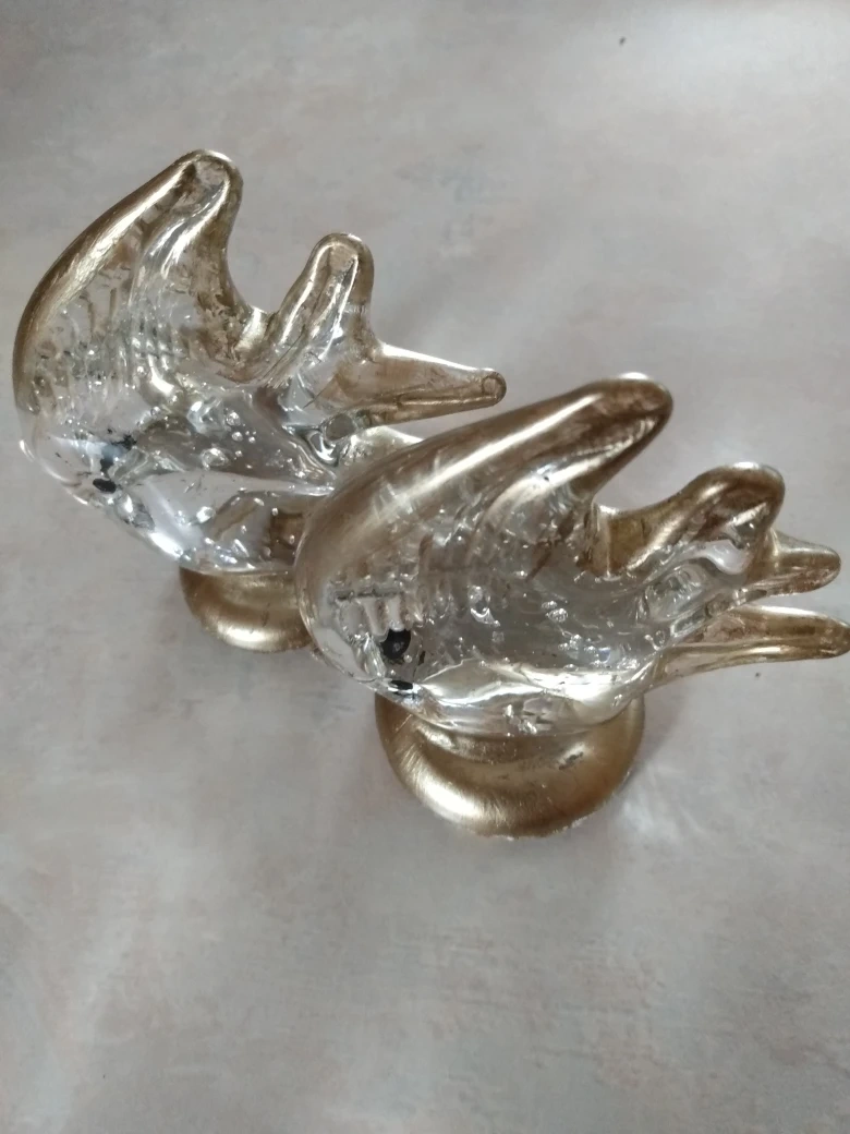 Two lovely glass fish figurines. Clear glass with gold accents. Small, decorative. Unique design. Perfect for a shelf or mantle. Cash Pick up .