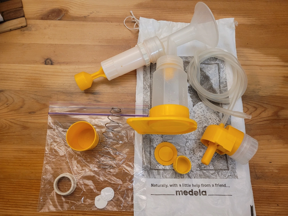 Used Medela Lactina breast pump with extra replacement parts. Includes various yellow plastic components, tubing, membranes, and small parts. Good condition. it is hand pump with poison action. Comes with accessories to connect it to electric pump, stand, supportive spring, etc. Also replacement elements, compatible with electric pumps. It's simple and functional, easy to clean $20 obo Have additional bottles and other accessories if needed at my other listings