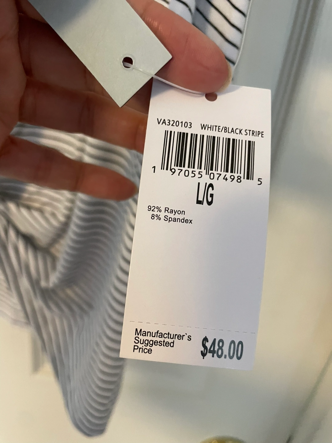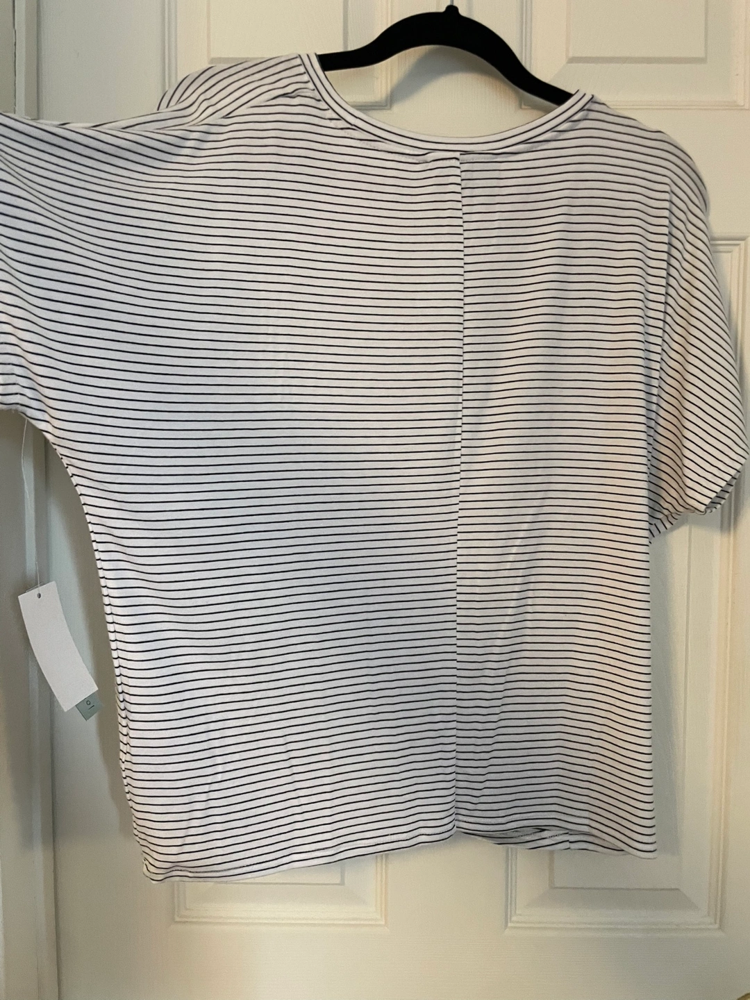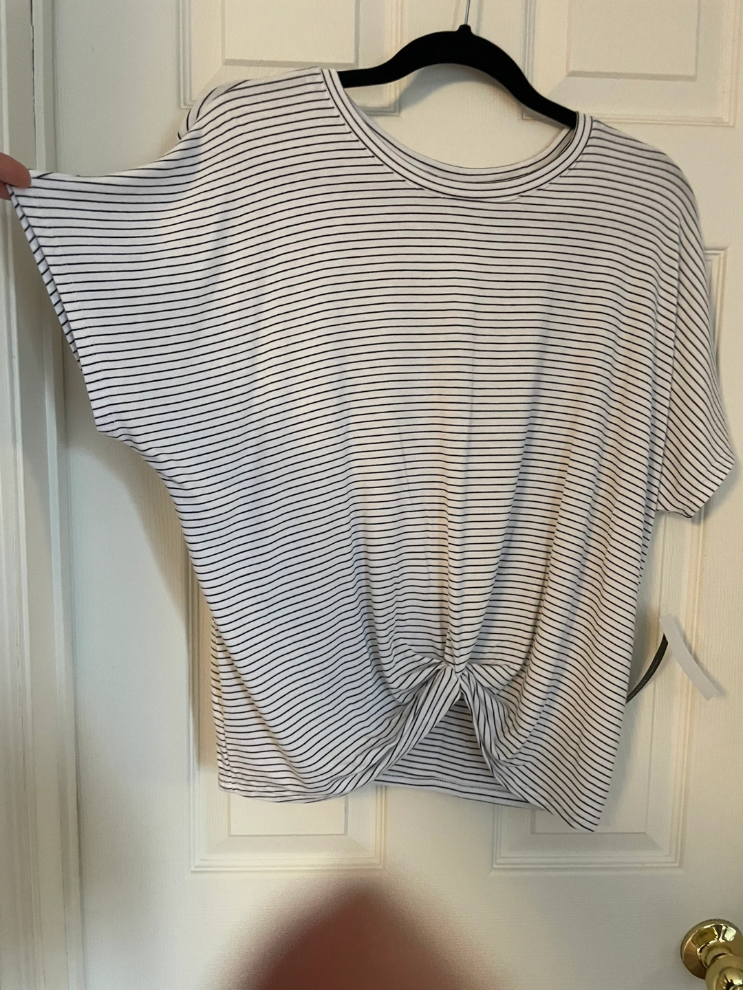 Brand new with tags. White and black striped shirt. Short sleeves. Knotted front. Size large.