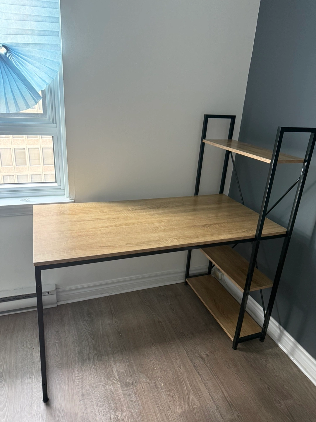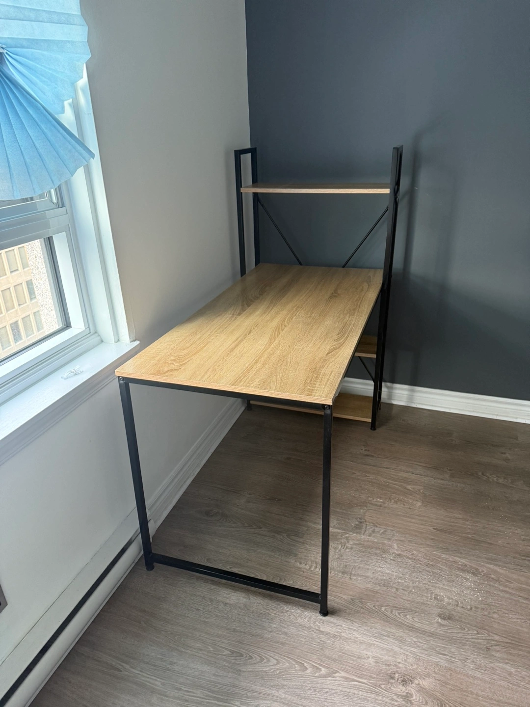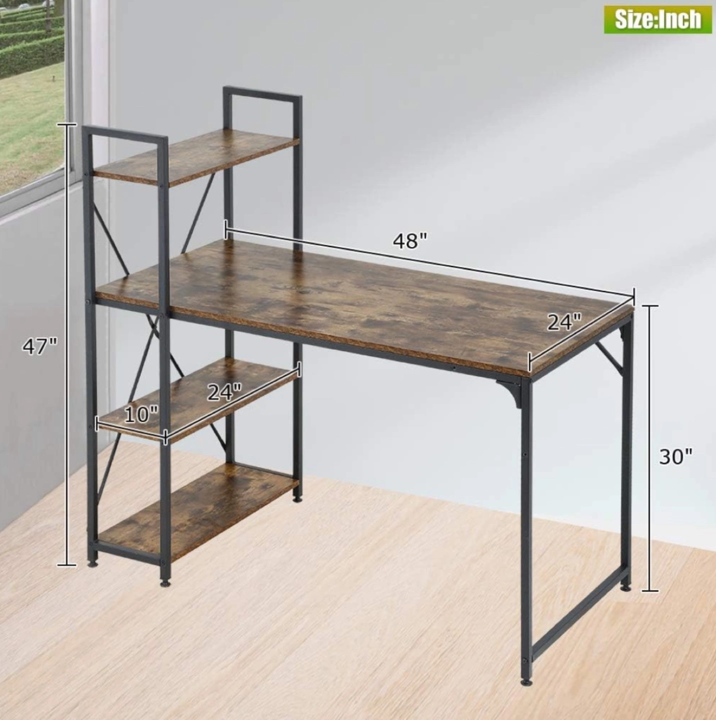 Stylish computer desk, rustic brown finish. Metal frame. Three shelves for storage. Great for home office or small spaces. Dimensions shown in image.