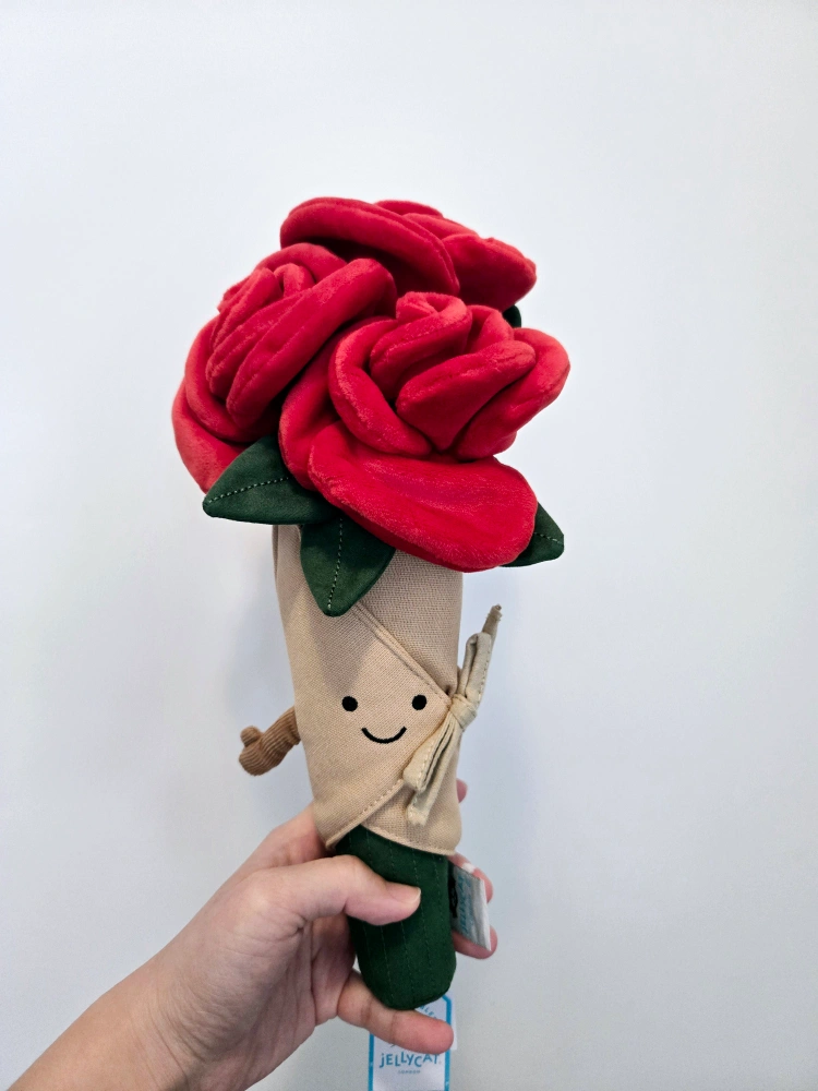 Adorable plush toy. Features a bouquet of red roses wrapped in beige fabric. Small, happy face. Green stem.