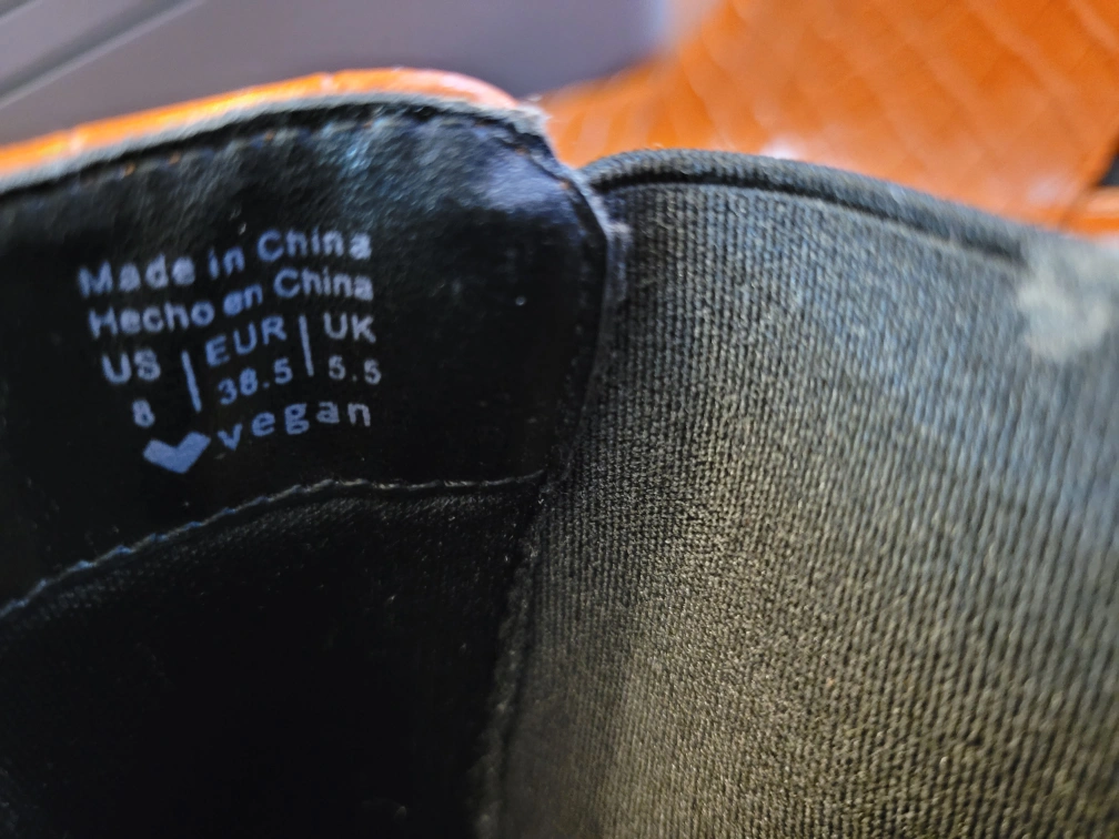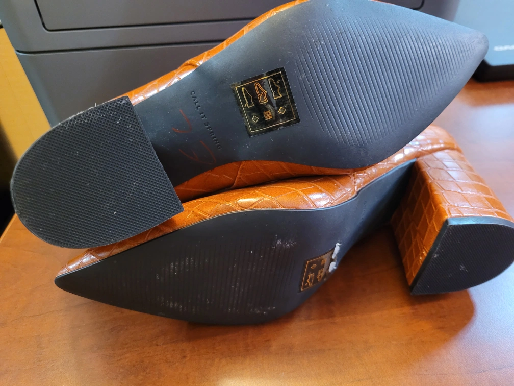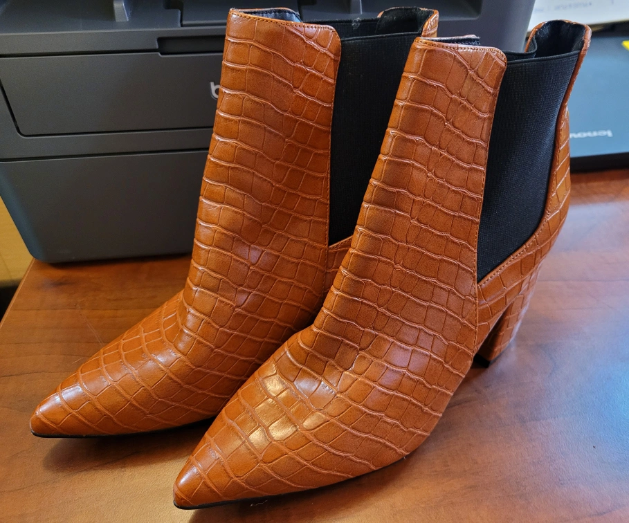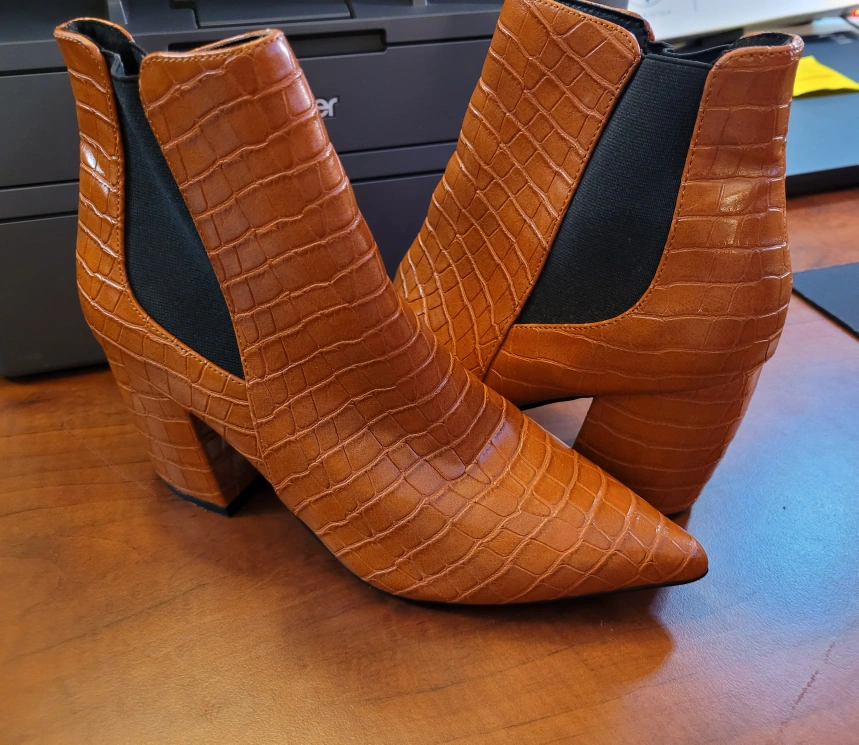 New Women's ankle boots. Brown, crocodile-embossed vegan leather. Block heel. Pointed toe. Size 8.