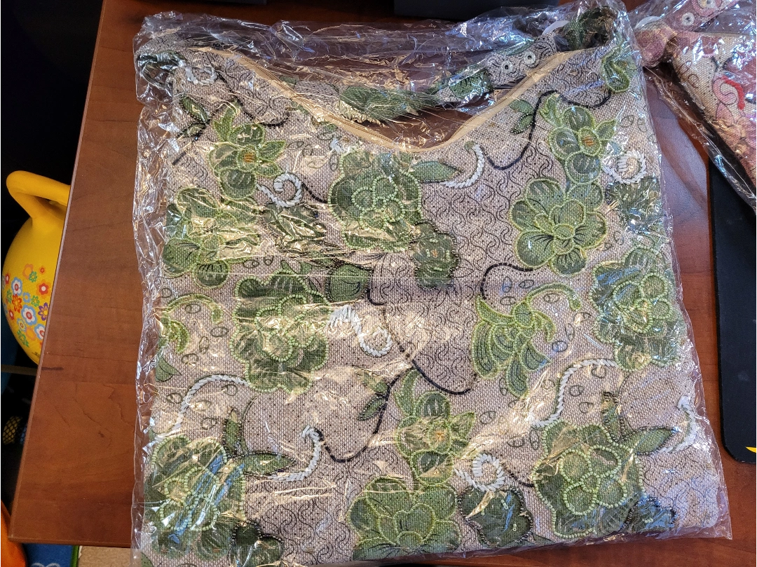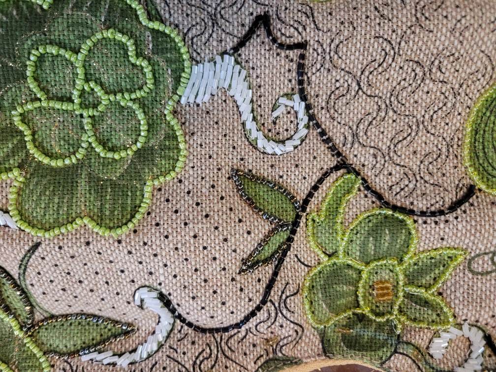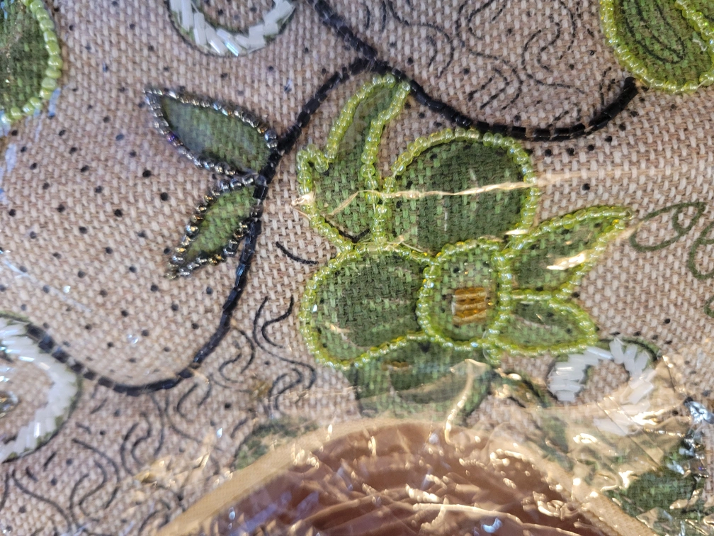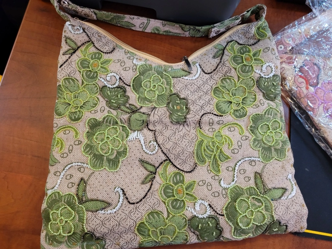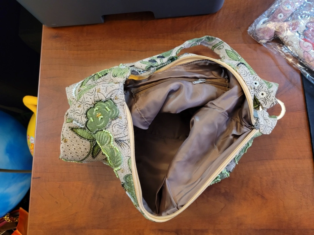 Unique y2k handbag. Beige fabric base with green and white beaded floral accents. Zip closure. Shoulder strap. Interior zippered pocket. Great for everyday use.