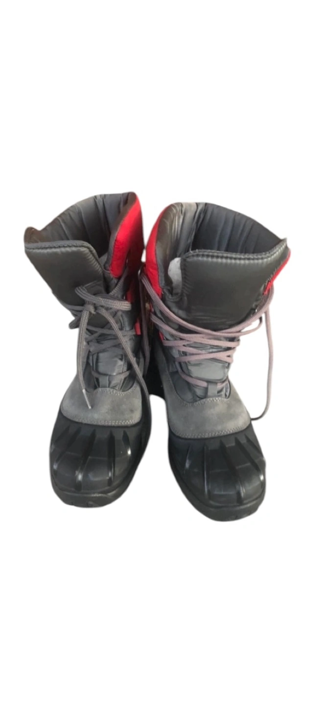Grey and red kids' winter boots. Lace-up style. Includes attachable ice grips for added traction.