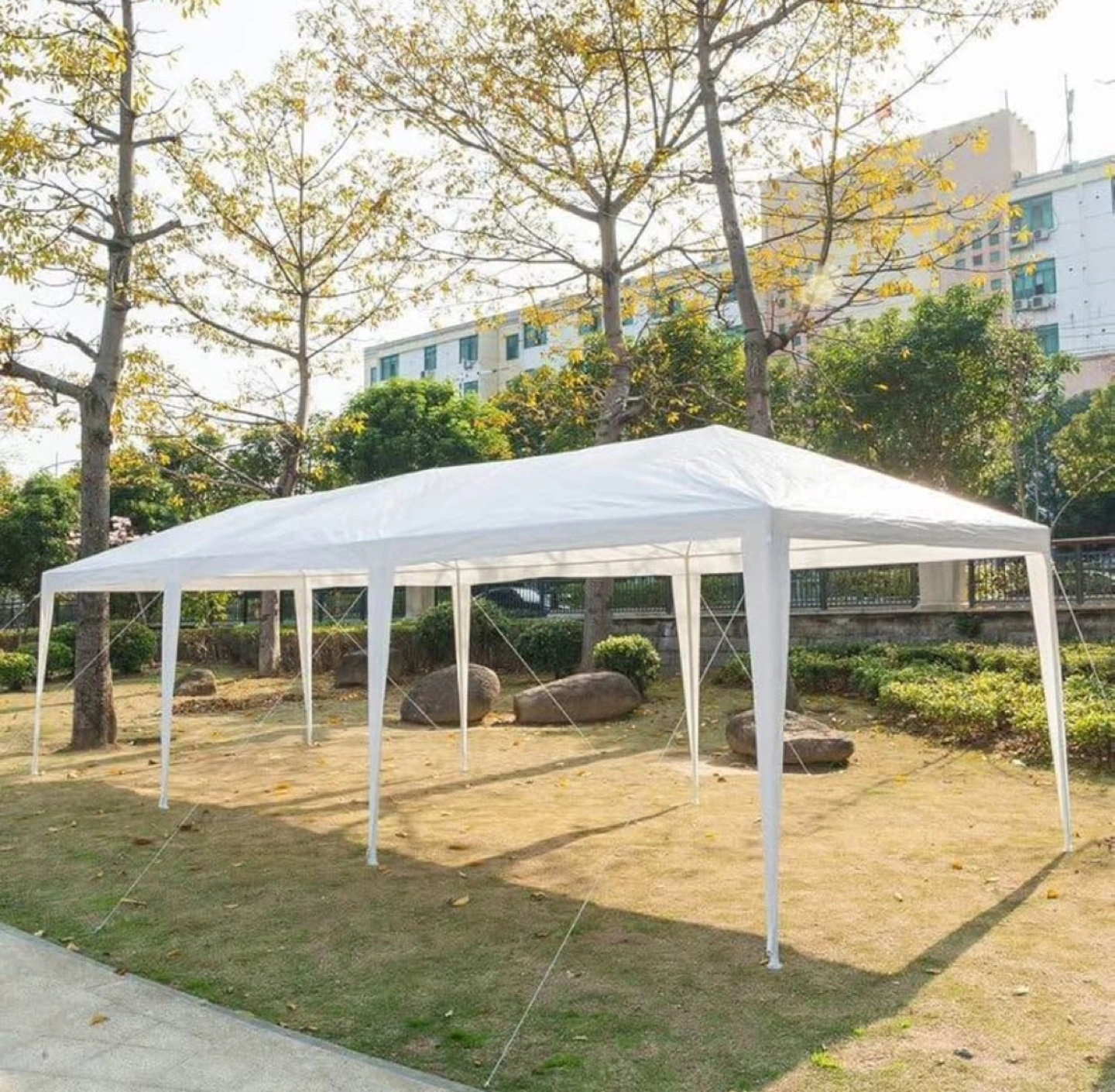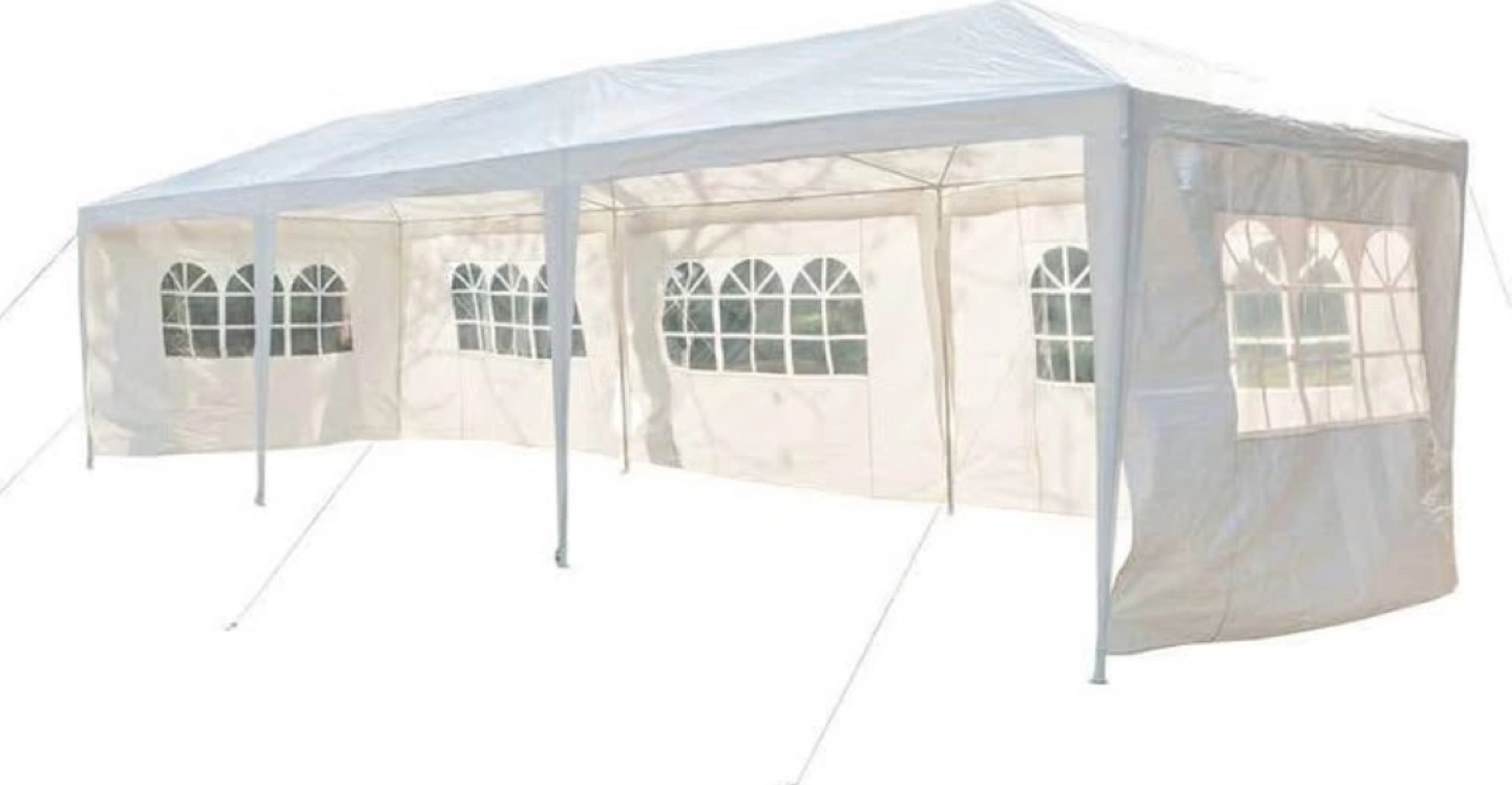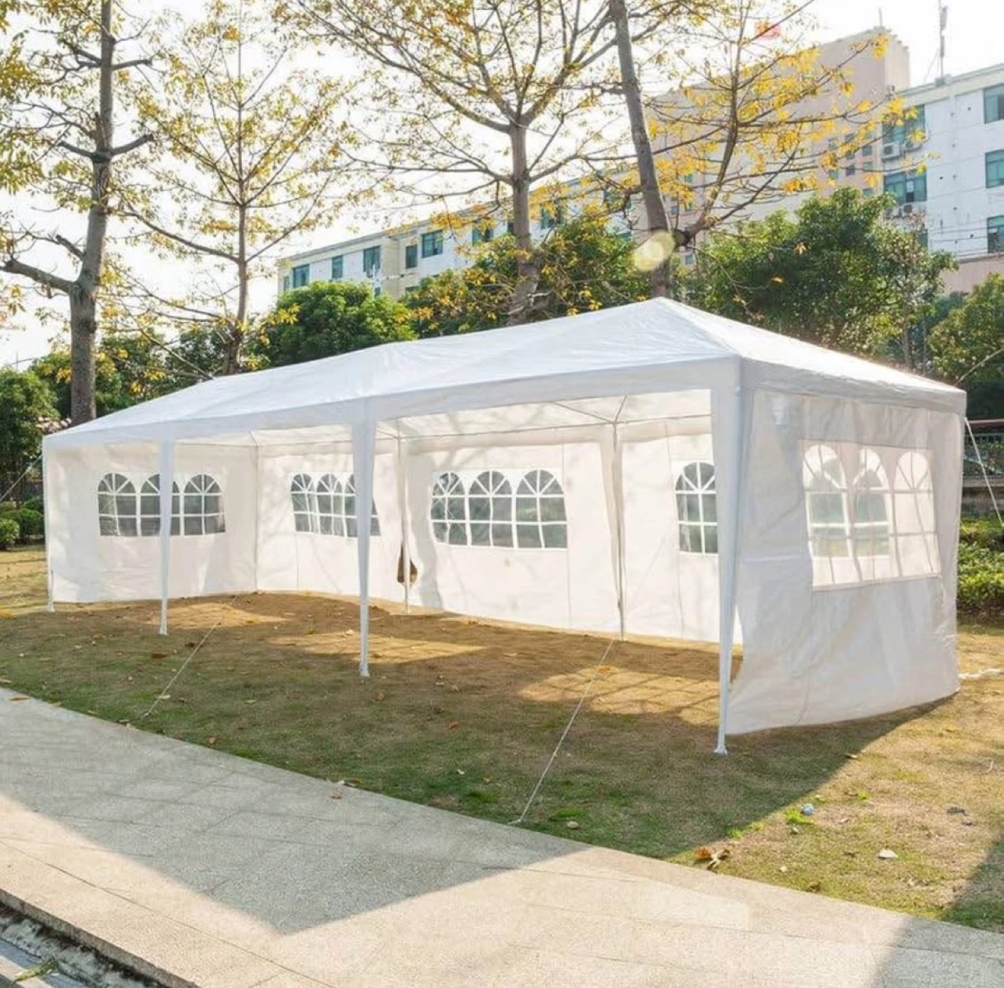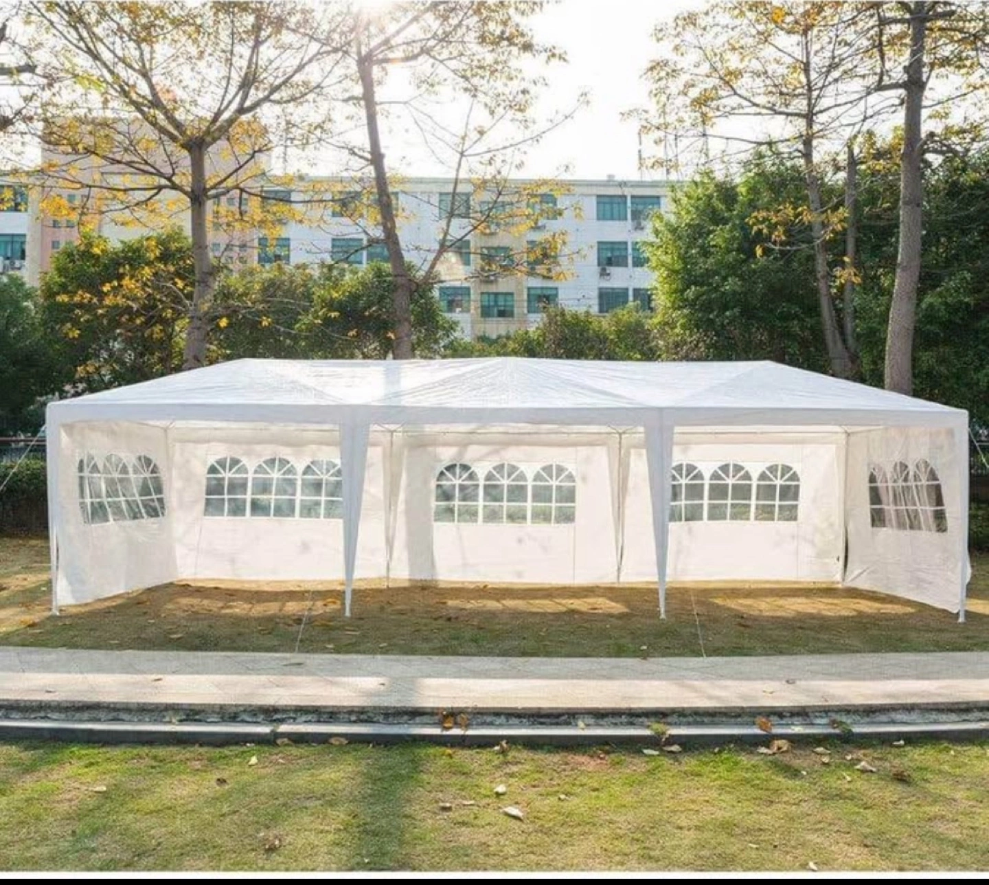 EASY TO ASSEMBLE The party tent is easy to?assemble. You d better to have an assistant to help no additional tools of the canopy tent are required just keep the frame steady when assemble the wedding tent steel tube and cover. MULTIPLE USAGE The party tent is perfect for wedding party meeting camping and so on. And you can used the wedding tent for backyard barbecue with your friends or the canopy tent is the best choice for your birthday party as well. BIG SIZE The party tent size is 10 x 30 x 8.5ft (LxWxH) ;made with 5 sides walls with window provide the canopy tent more shade. The wedding tent can hold up to an estimated 50 people for dining or party. HIGH QUANITY The party tent have rust & corrosion resistant white powder coated steel framework 0.6/0.7mm Steel tube new material plastic connector of wedding tent make the frame stronger than others ?we provide the the canopy tent with ropes and Stakes for added Stability ATTENTATION We advise customers to never leave canopy tent up overnight or under bad weather conditions. We will not be responsible for such weather damages. It is up to customers decision to determine the correct weather condition when you choose the party tent. Warning: Polyethylene Fabric of party tent is not fire proof pls be away from sources of fire. Please assemble the tent with you your friend or who can help.