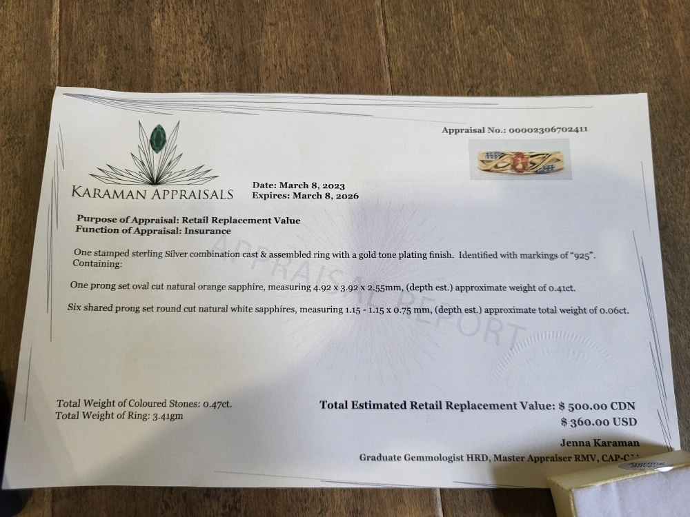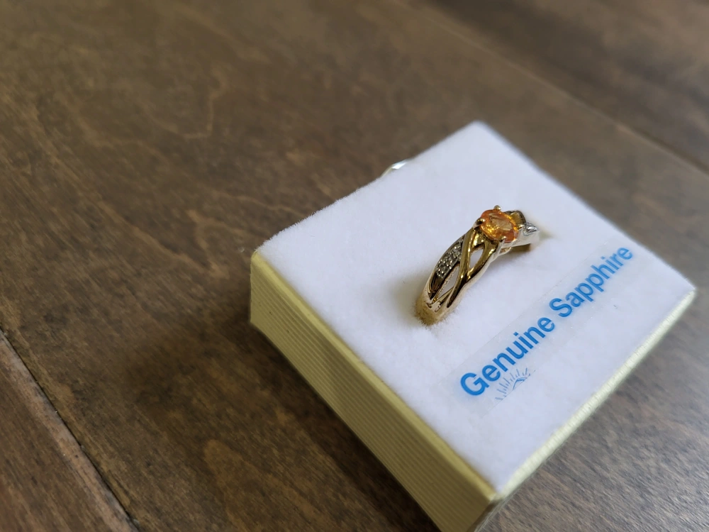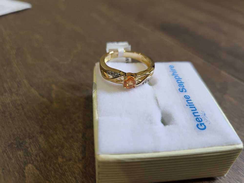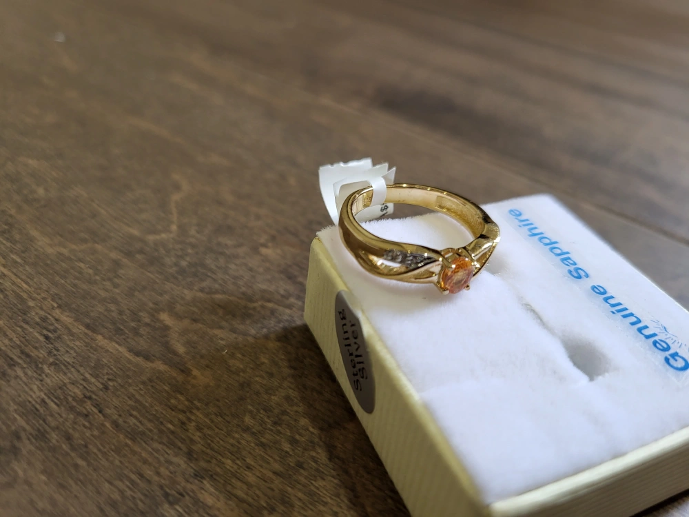 Sterling silver ring with gold plating. Features an orange sapphire and white sapphires. Comes with appraisal. Size 6.75. 0.47 carat natural stone.