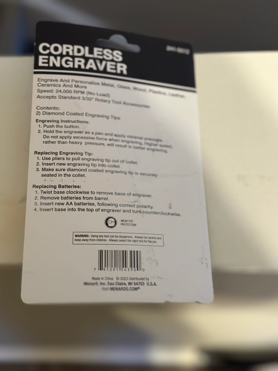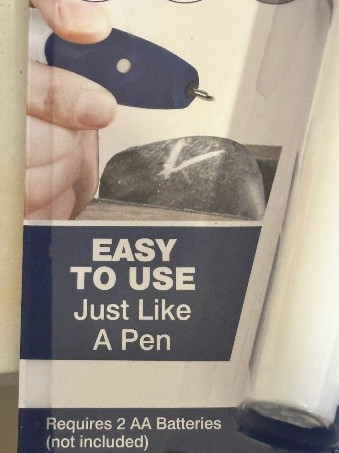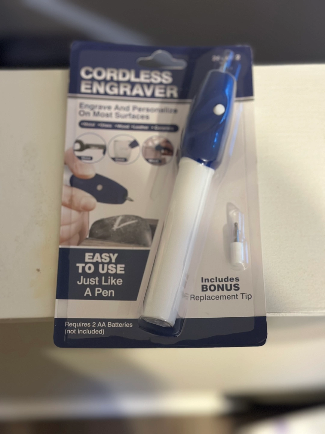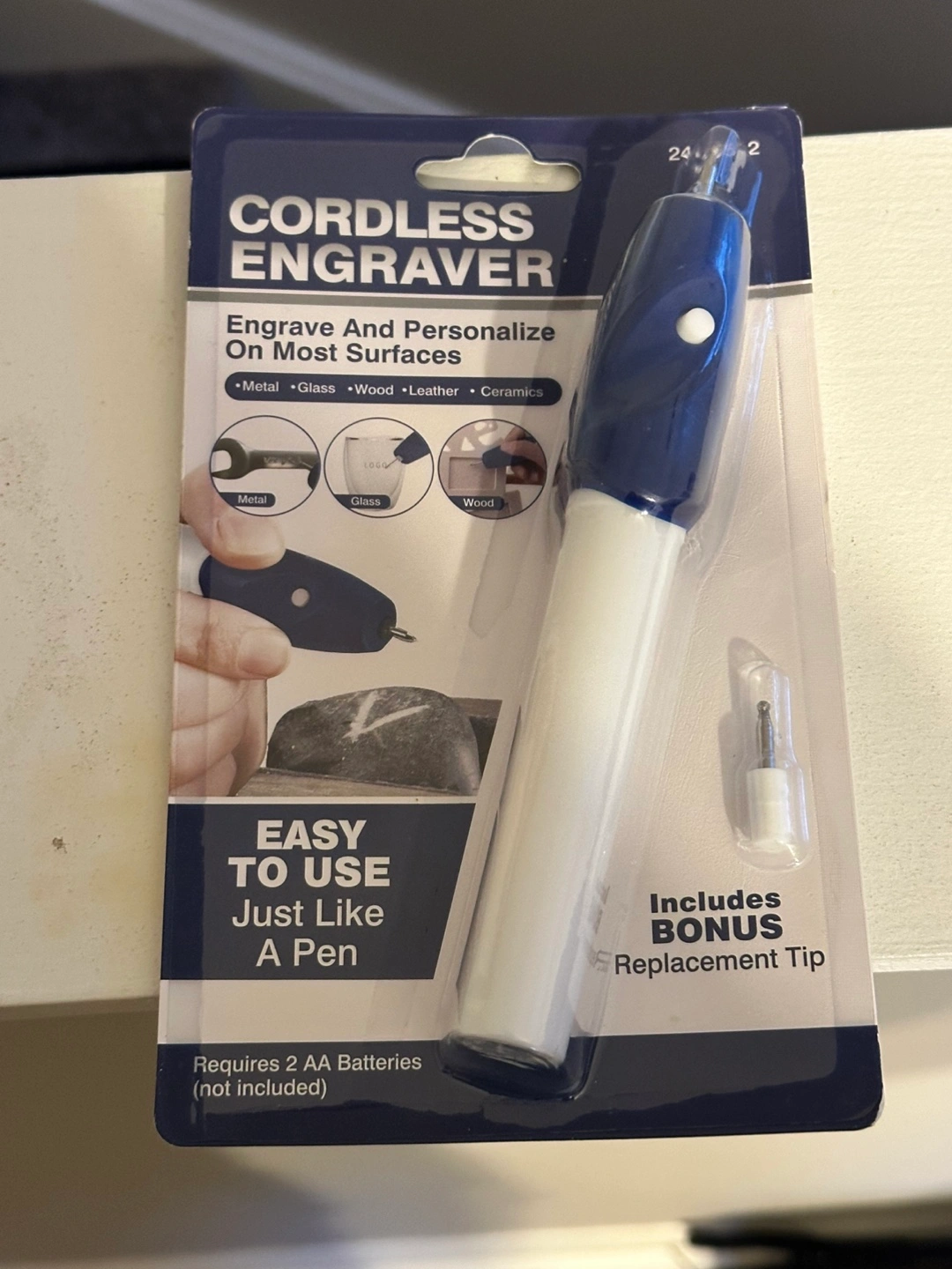 New cordless engraver. Engraves metal, glass, wood, leather, and ceramics. Easy to use, like a pen. Includes replacement tip. Requires 2 AA batteries (not included).