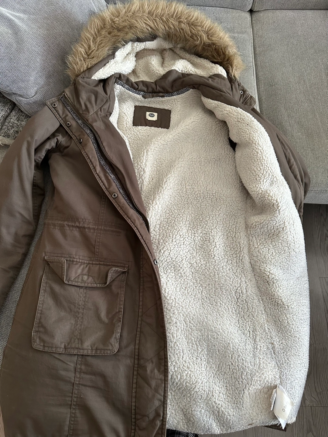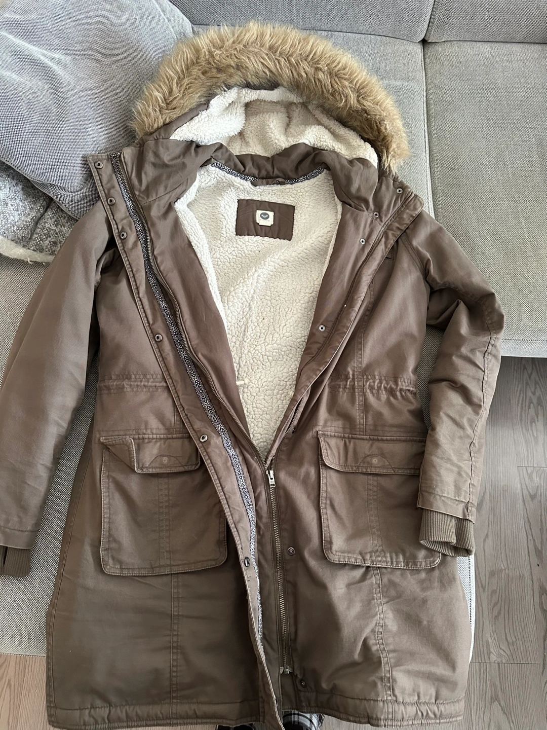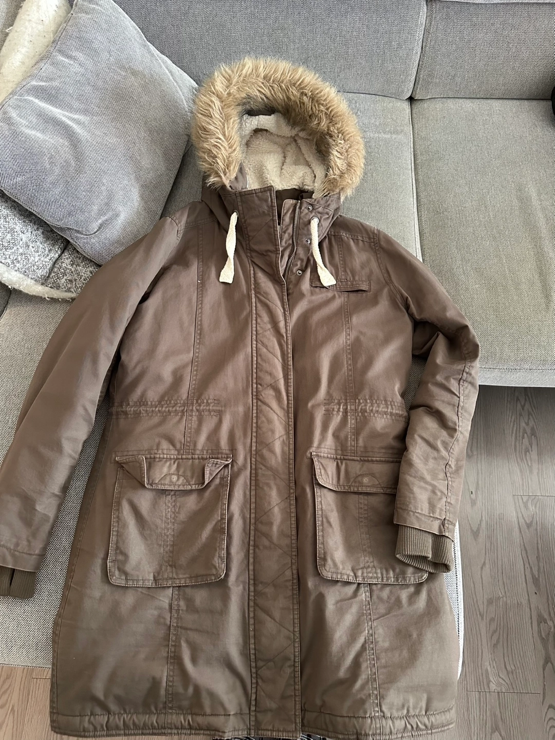 Women's 3/4 length parka. Olive/brown colour. Faux fur lined hood. Sherpa fleece lining. Multiple pockets. Drawstrings at waist. Very warm! Pet and smoke free home.