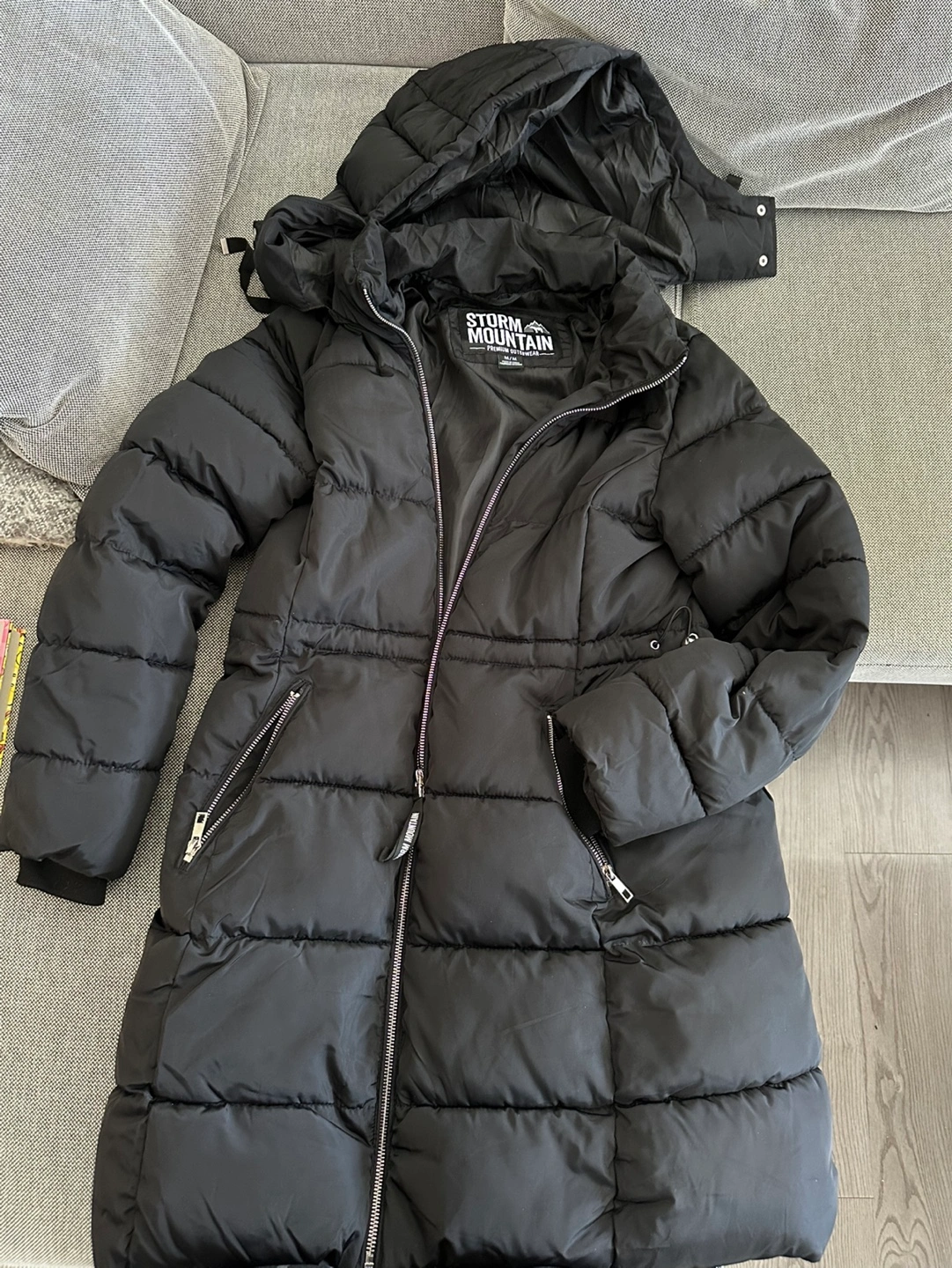 Long black puffer jacket. Features a hood and zipper closure. Side pockets included. Excellent for cold weather. Worn twice, basically brand new.