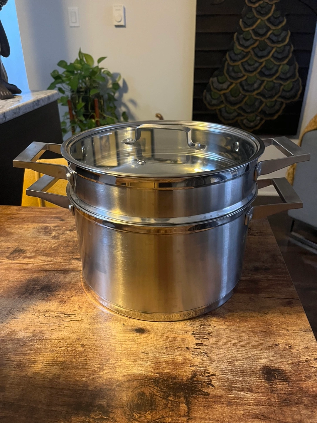 Brand New. Large capacity stainless steel steamer. Two-tiered design. Glass lid included. Suitable for stovetop use. Handles on both tiers. Excellent for making broth.