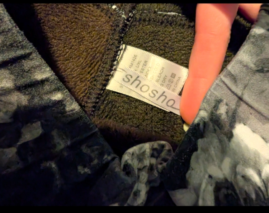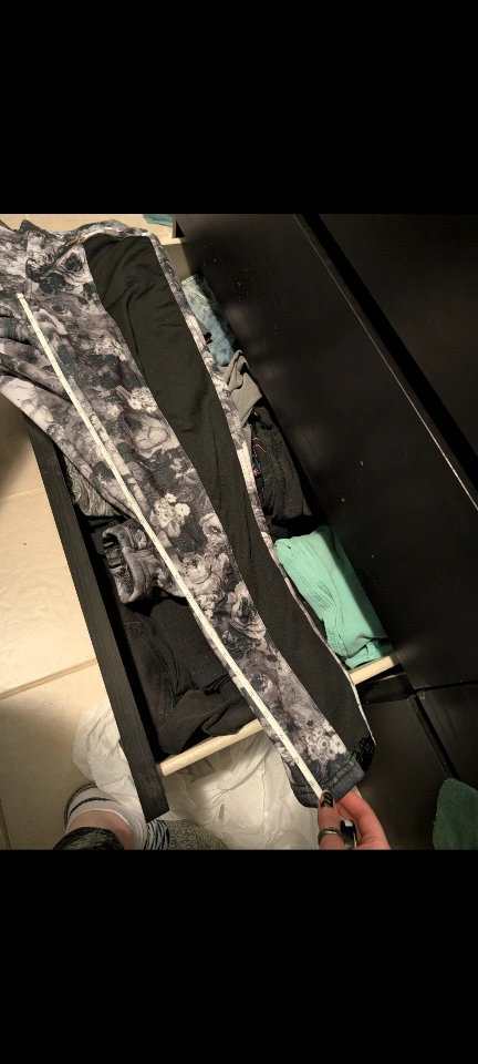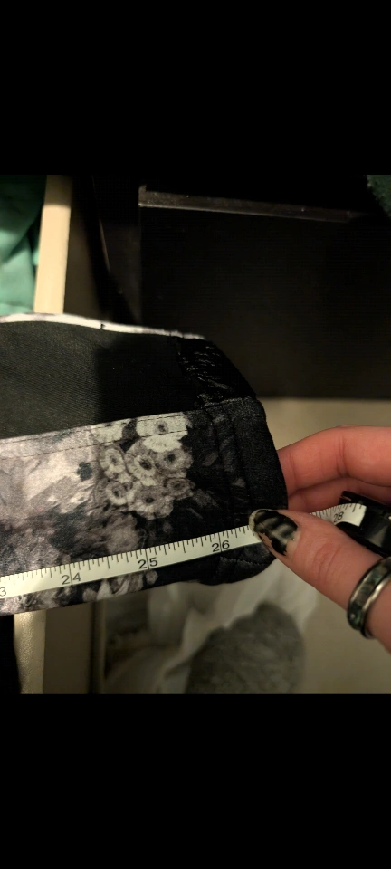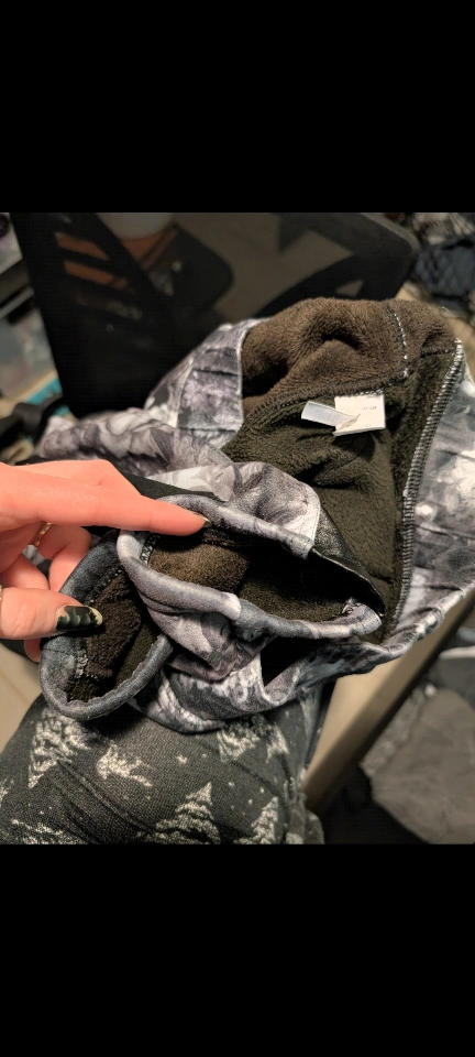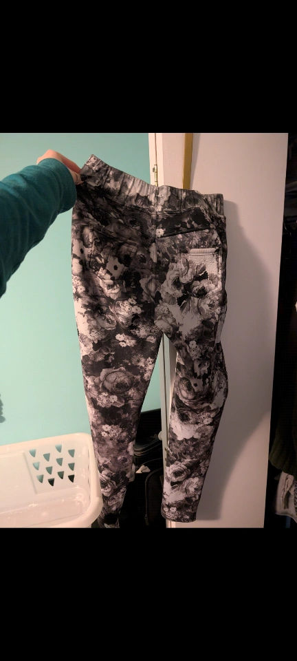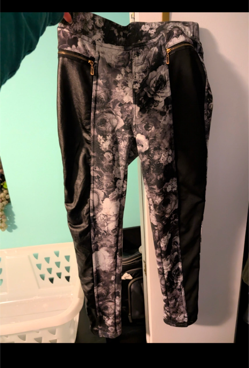 Black and white floral print leggings. Marked size for L/XL, but fits more like M-L. See photos for length measure. Fleece lined. Faux leather side panel. From home with dogs near Damen & Montrose.