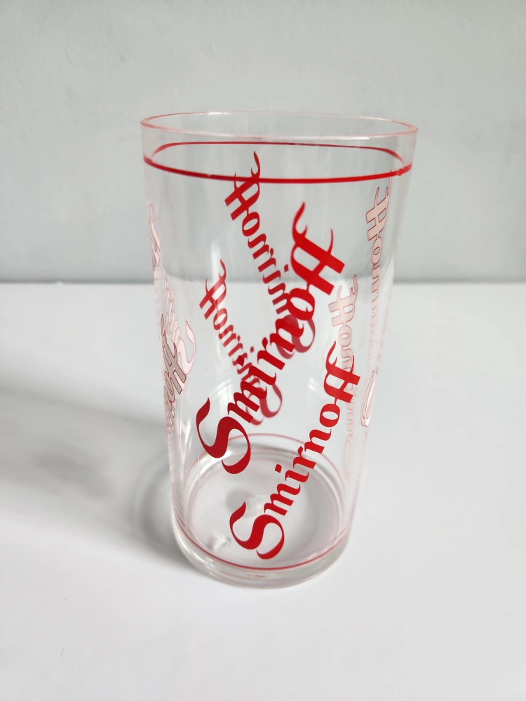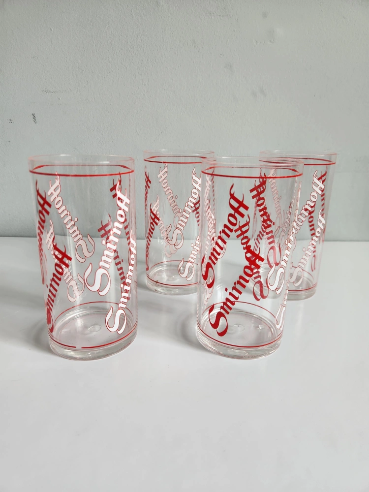 Set of four vintage Smirnoff glasses. Clear glass with red and white print. Collectible barware.