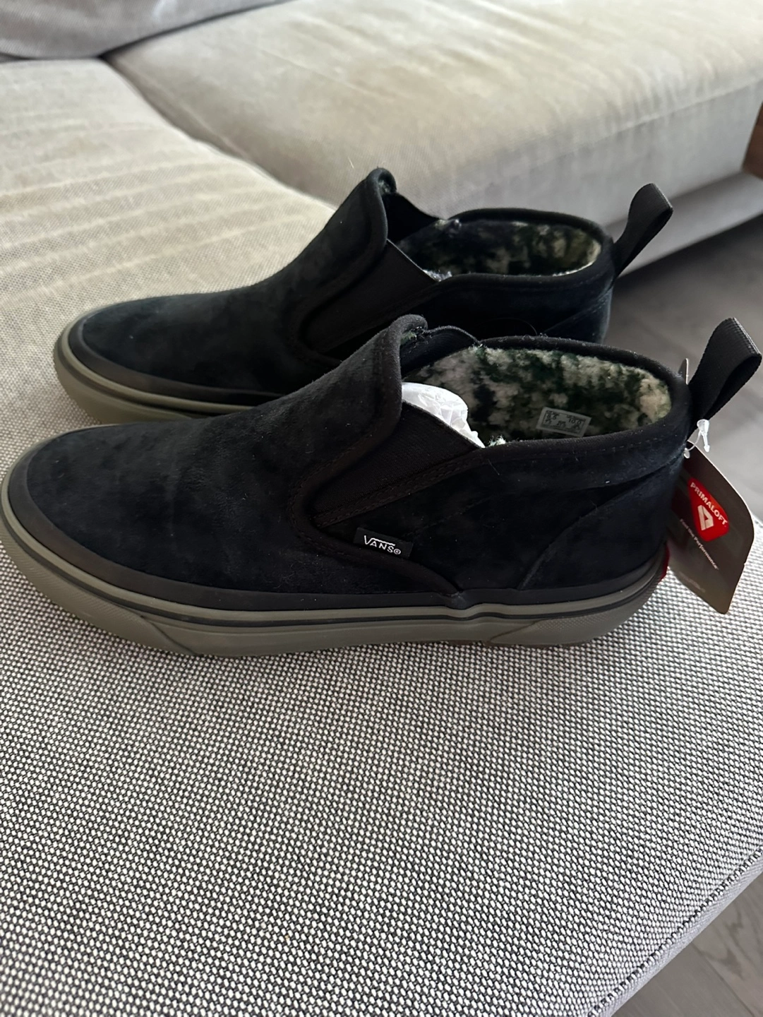 Unisex slip-on shoes. Black suede upper. Warm fleece lining. Durable outsole. UltraCush insole. Size US Men's 8.5, women’s 10. New with tags. Purchased in the states but sadly they’re a bit too big.