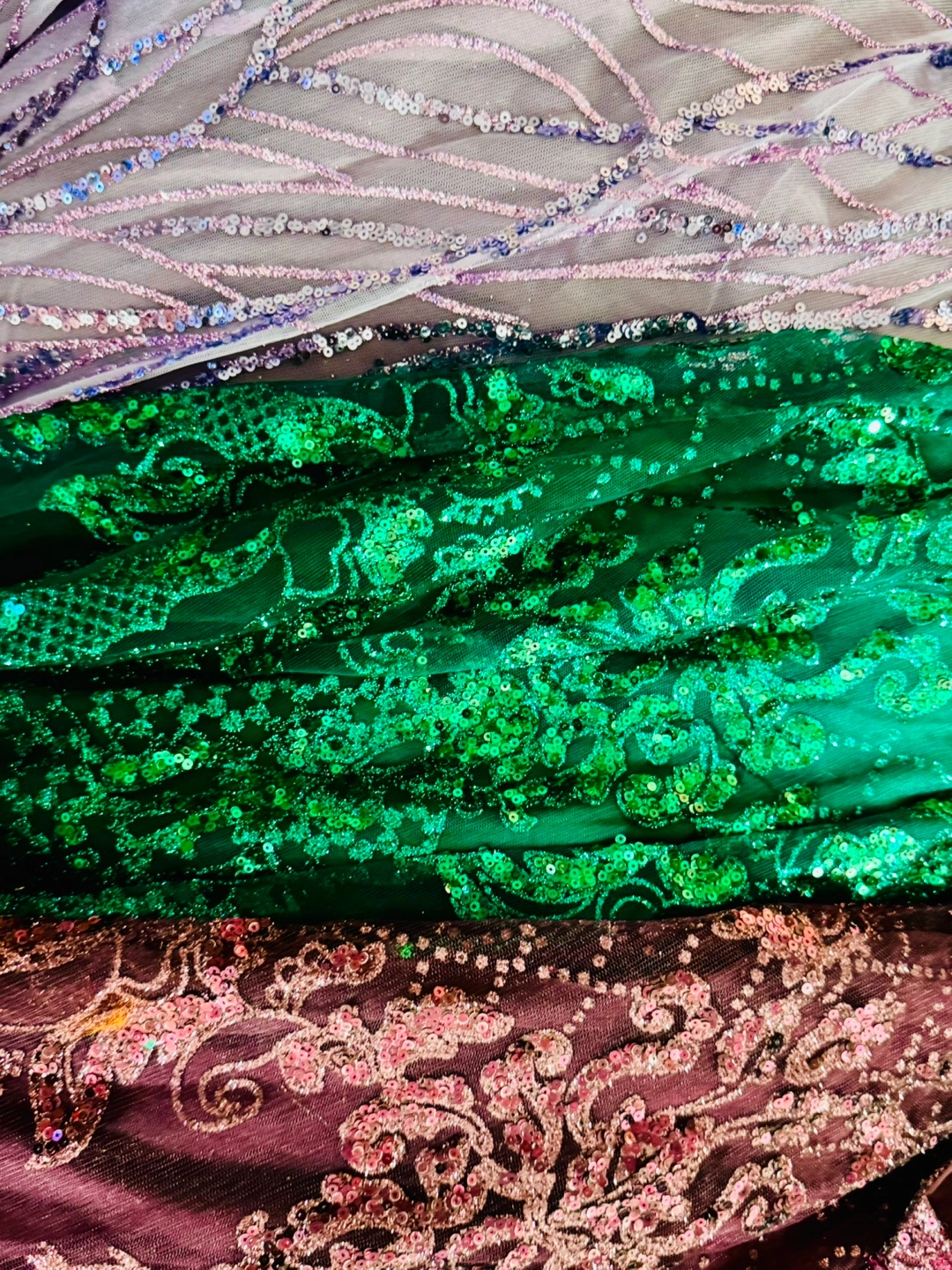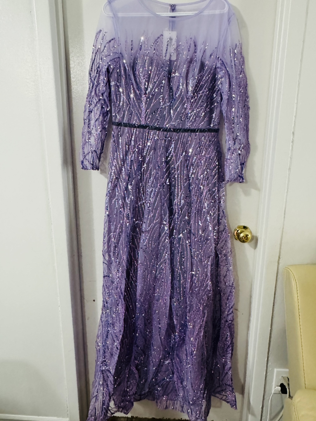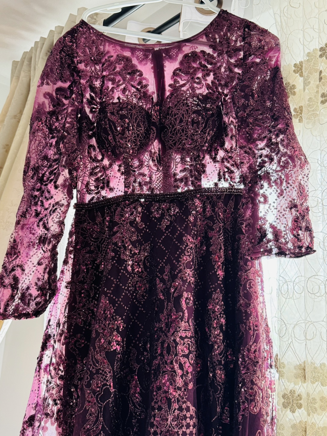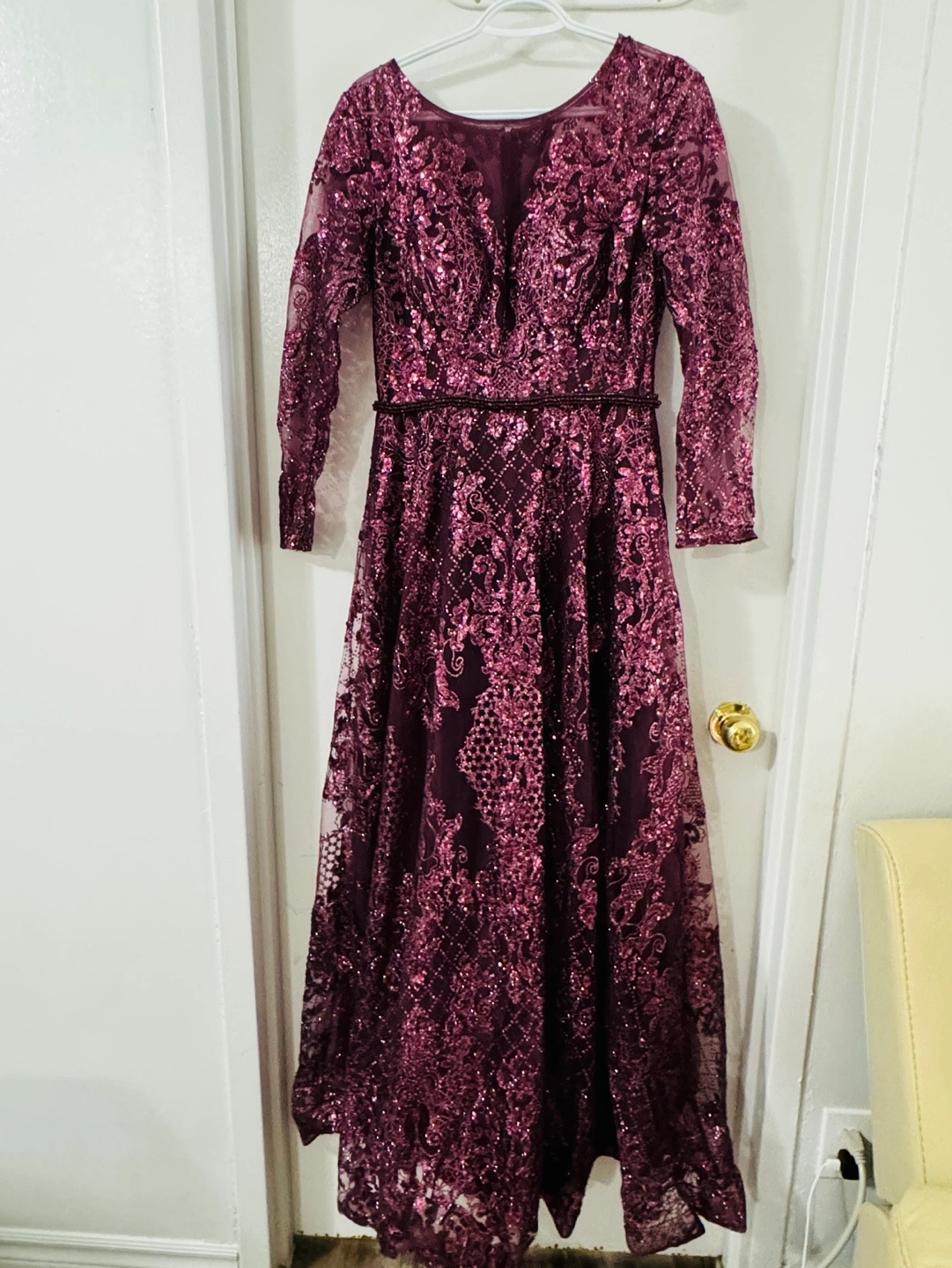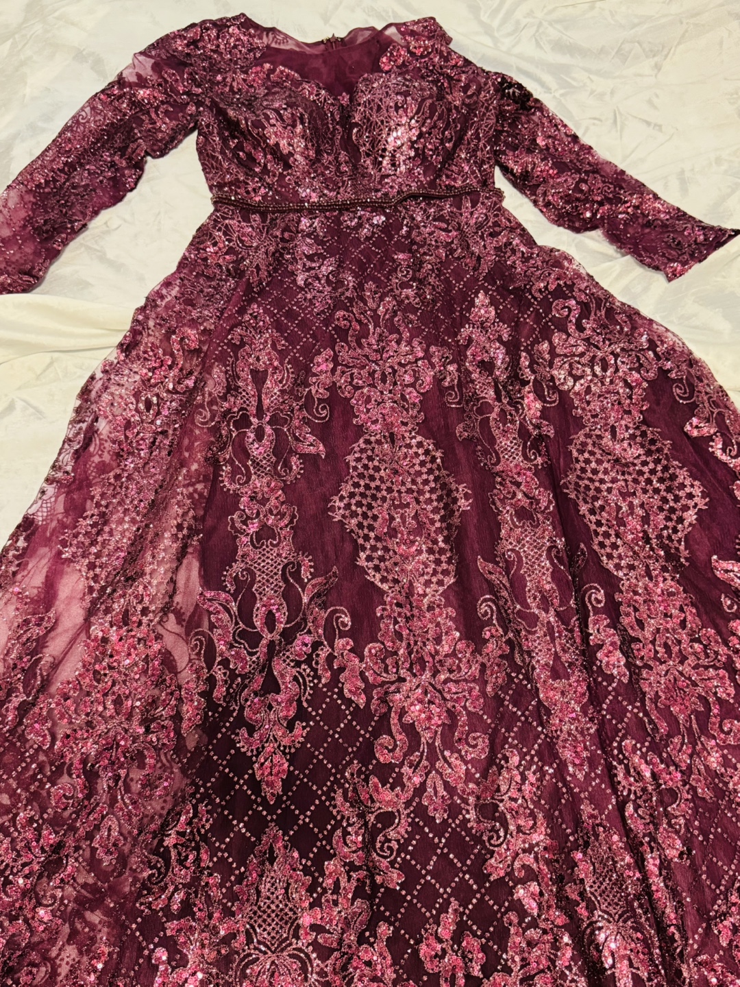 Stunning floor-length gown. Burgundy colour, long sleeves, sequin detail. Features a fitted bodice and a flowing skirt. Perfect for a special occasion. Beautiful sparkling prom party dress available! 💜