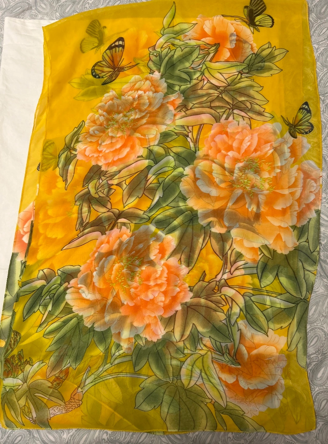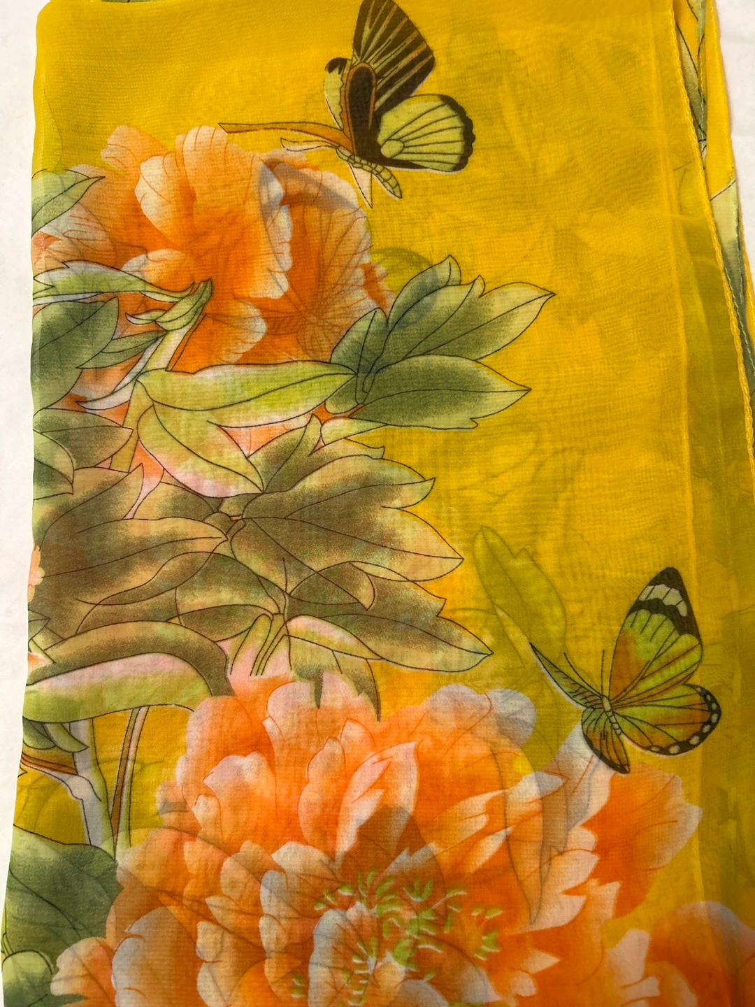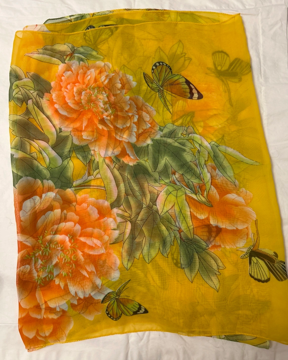 1000+Lightweight yellow chiffon scarf. Features orange peonies and butterflies. Beautiful colours. Great to wear for spring and summer. Clean and in perfect shape. Smoke & Pet free home. Cash and pick up only.