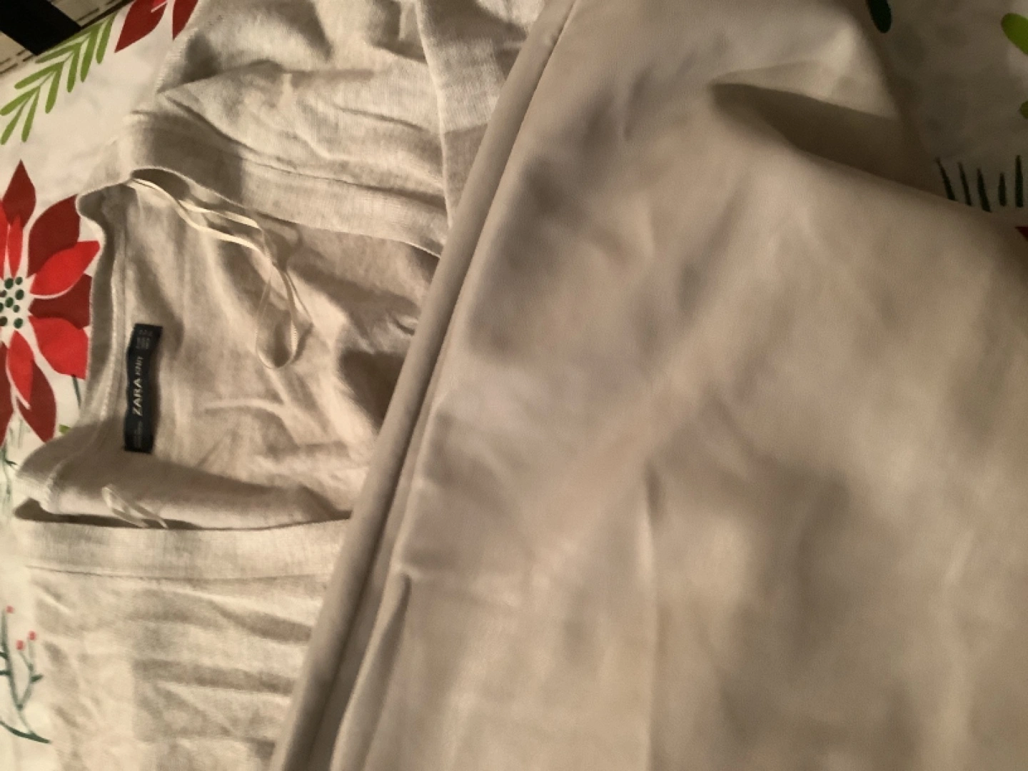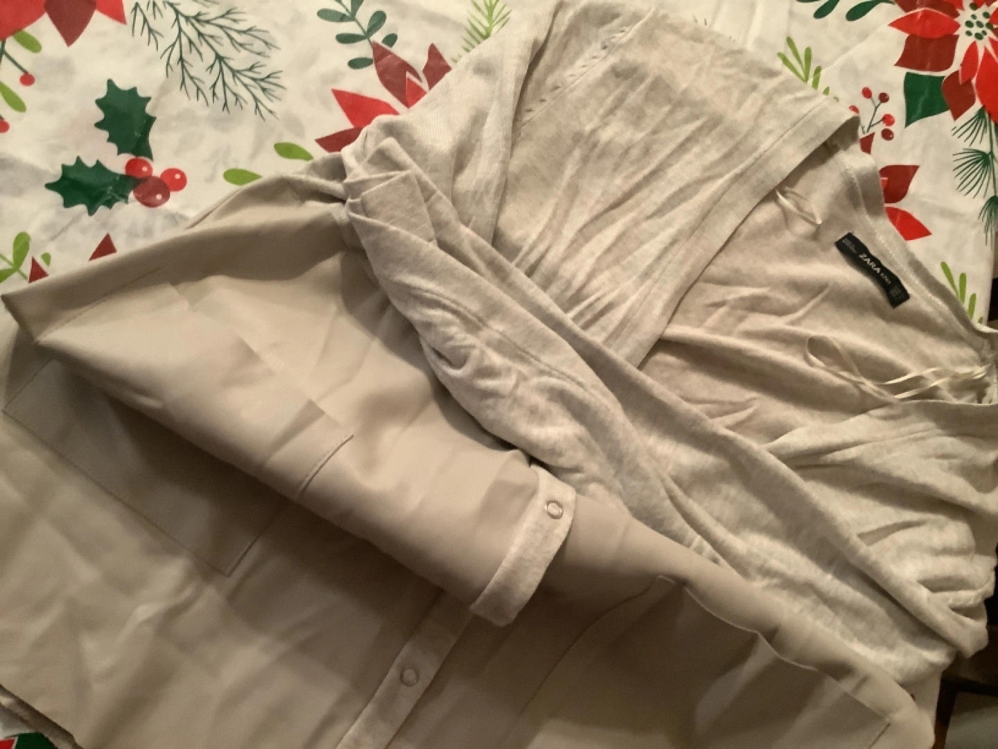 Neutral coloured cardigan and blouse. Lightweight material. Great for layering. Size Medium. It has a leathery texture around the waist area.