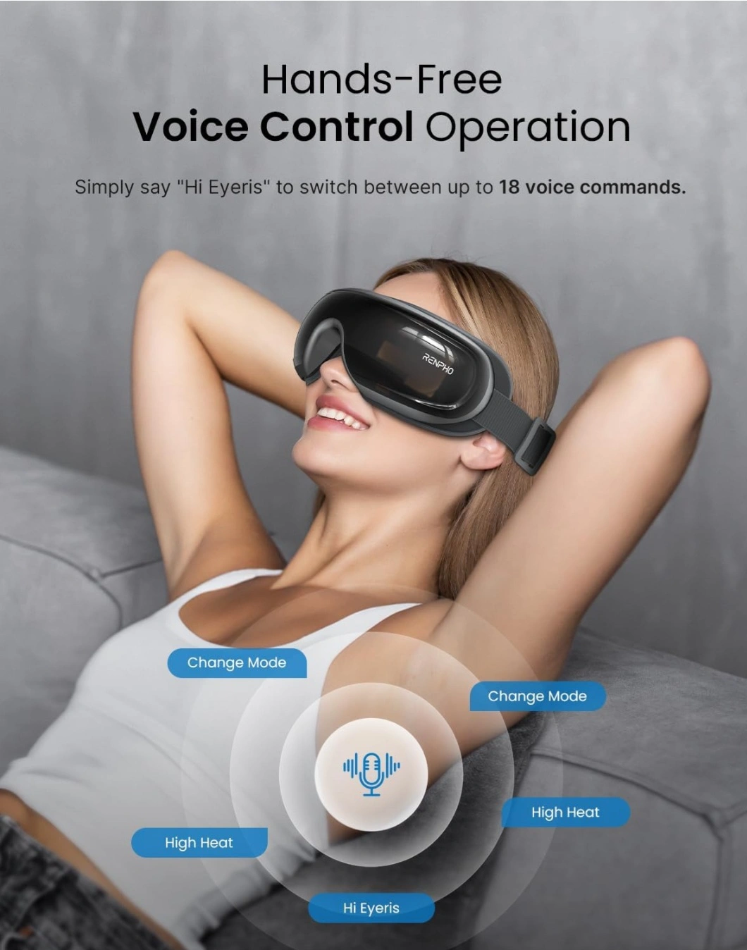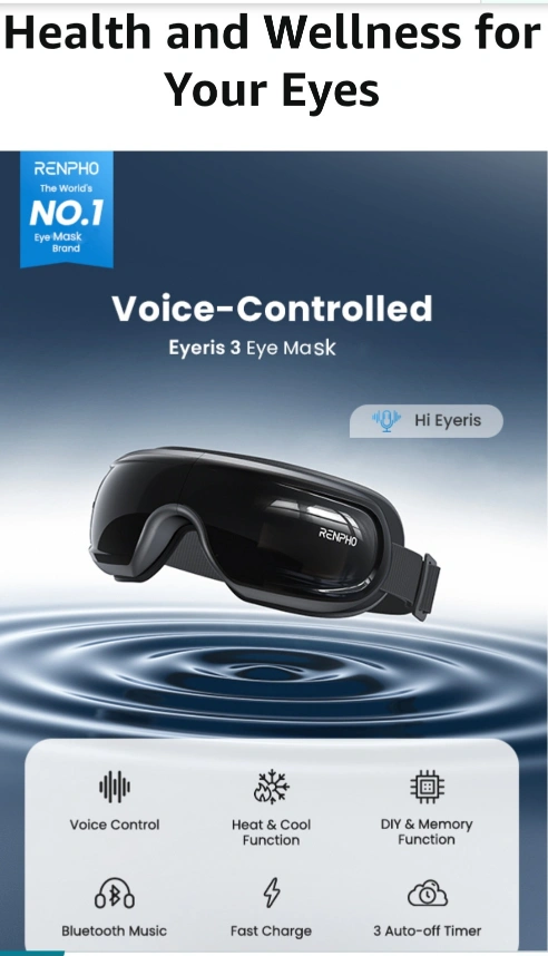 Relax and Unwind with the RENPHO Eyeris 3 HIGH TECH. EYE MASSAGER. Features: Bluetooth Music connectivity, Voice Control, customizable Heat and Cooling Therapy, and Three Massage Modes. Enjoy a personalized relaxation experience. **TREAT YOUR EYES & YOURSELF**