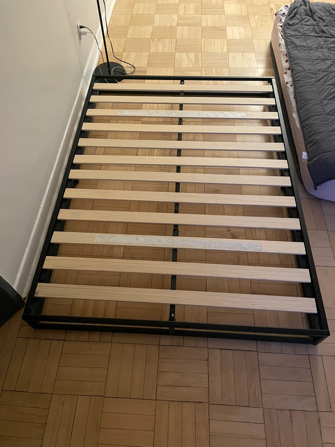Low bed frame with wooden slats. Minimalist design. Great condition.