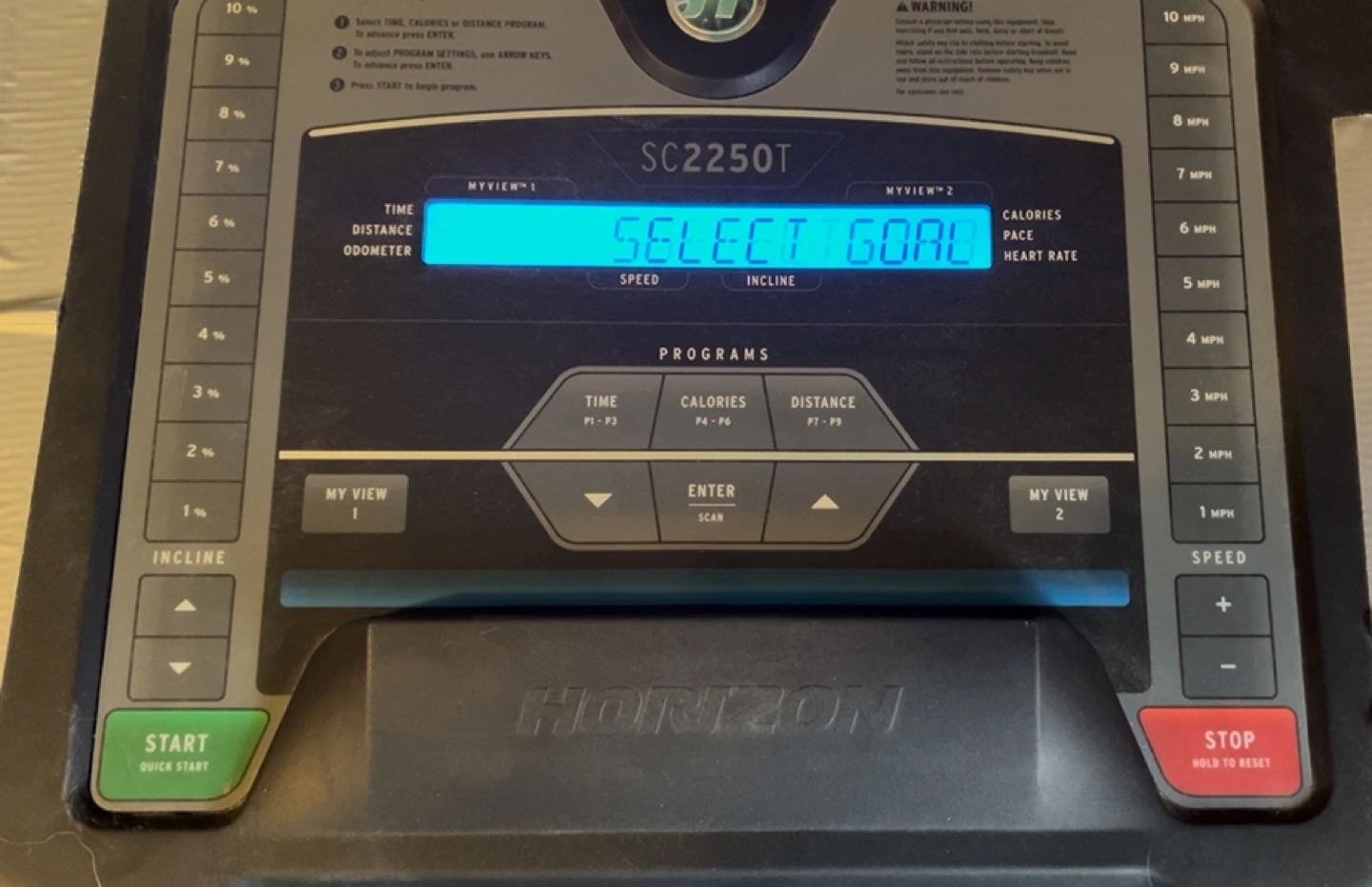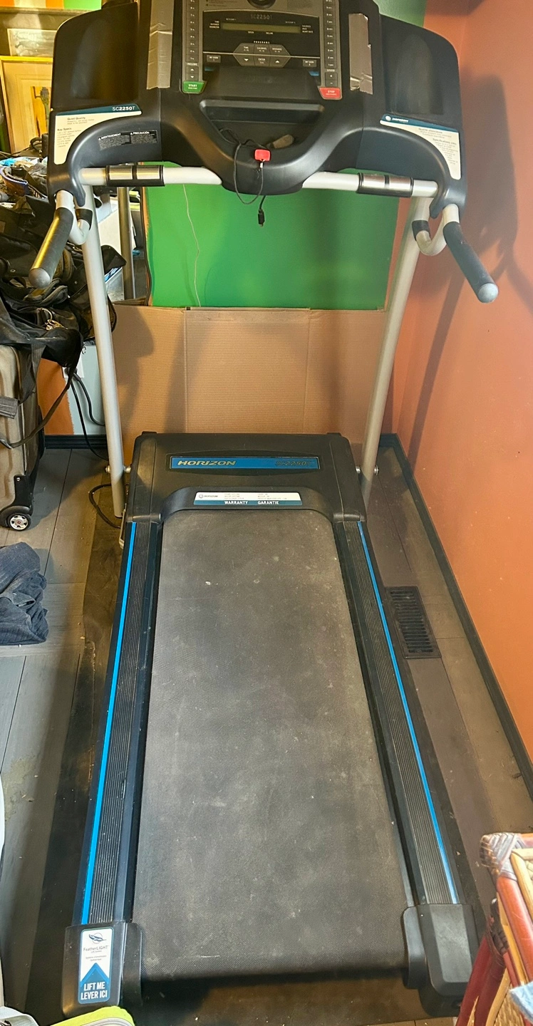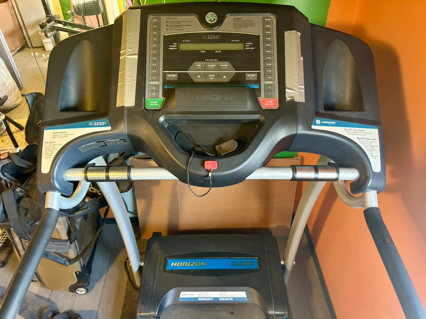 Used Horizon Fitness SC2250T treadmill. 20 x 50" workout surface. 2.0 CHP motor. 9 program options. 0-10% incline. 275-lb user capacity. Features FeatherLight Lift System.