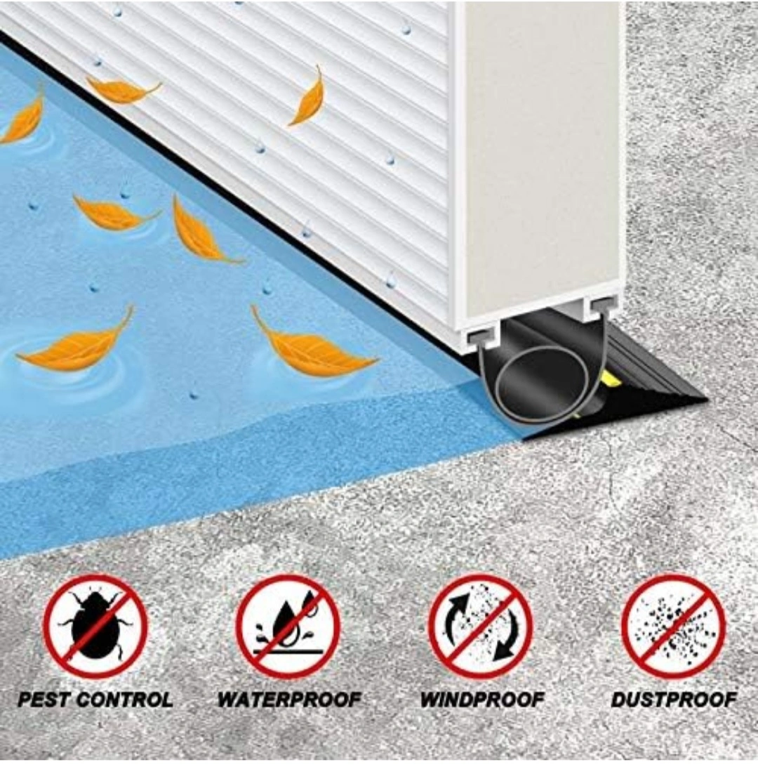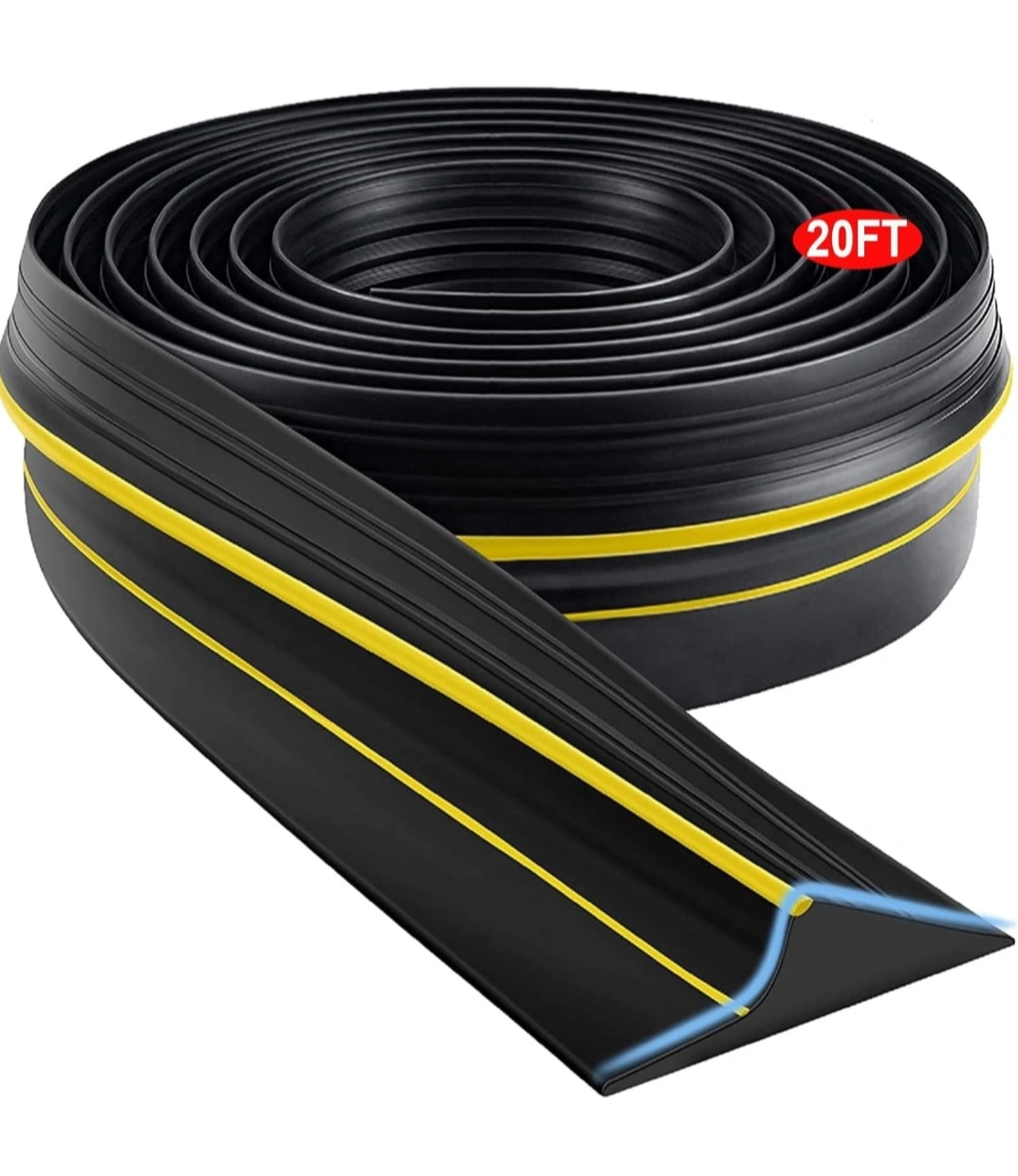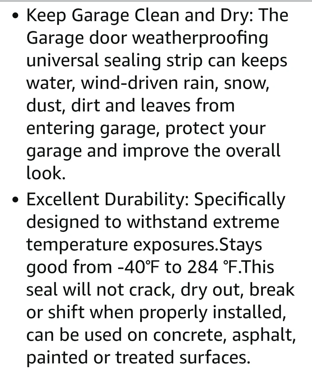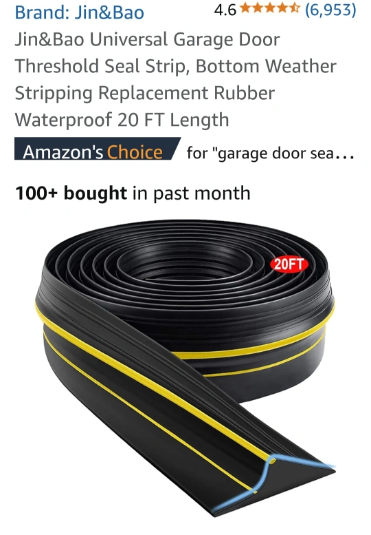 GARAGE DOOR BOTTOM WEATHER STRIPPING. Waterproof and Windproof. Keeps out Dust, Bugs, Snow, and Rain. High-Quality, Durable Rubber, Flexible, and anti-slip. Visable Yellow Stripes prevents Tripping. 12 ft ($20) & Easy installation.
