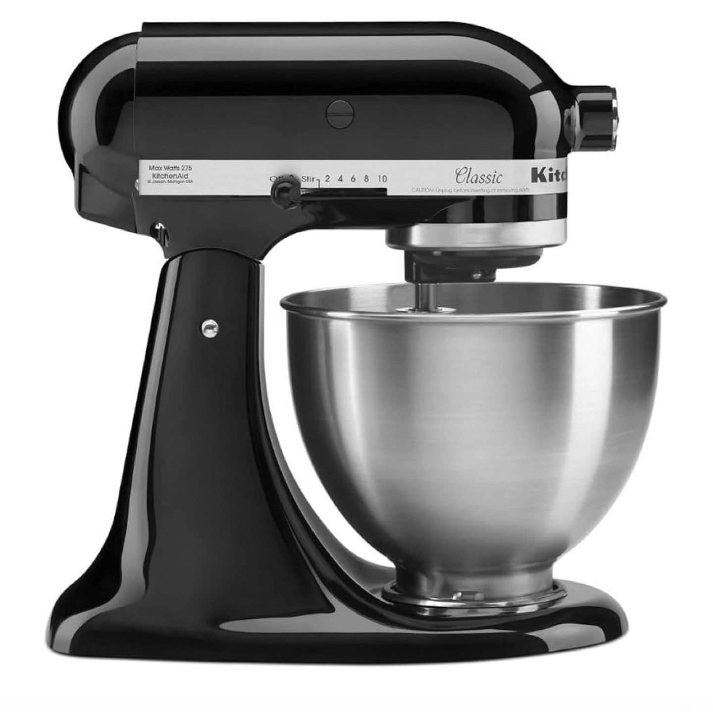 Classic KitchenAid stand mixer. Black colour. Includes stainless steel bowl, whisk, dough hook, and paddle. Excellent condition.