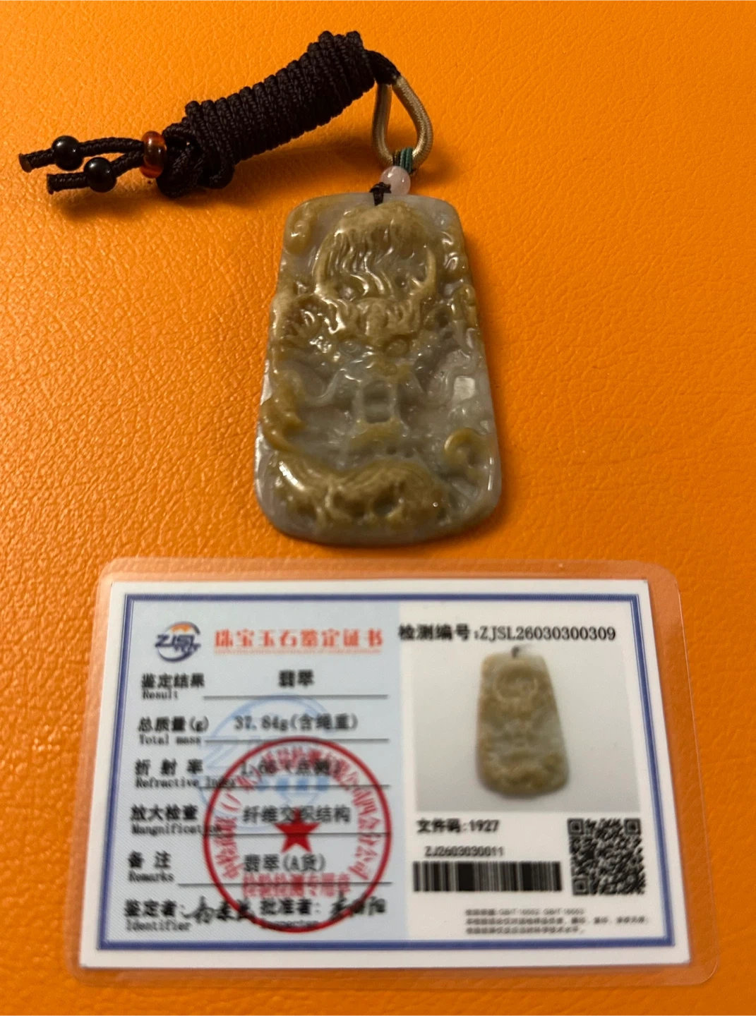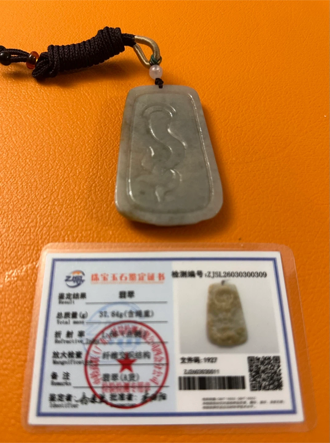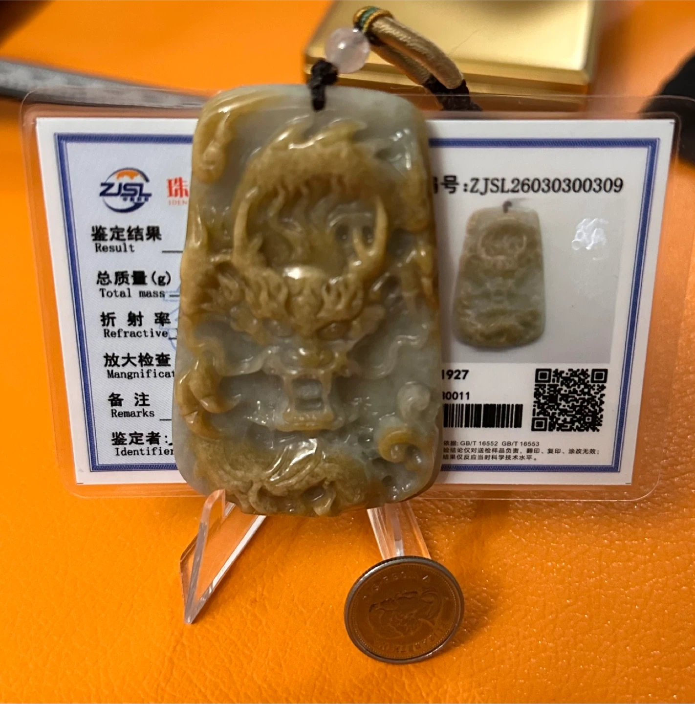 A carved RARE jade pendant featuring a dragon design. It weighs 32.84g and comes with authenticity certificate. This piece is suitable for those who appreciate intricate stone carvings.