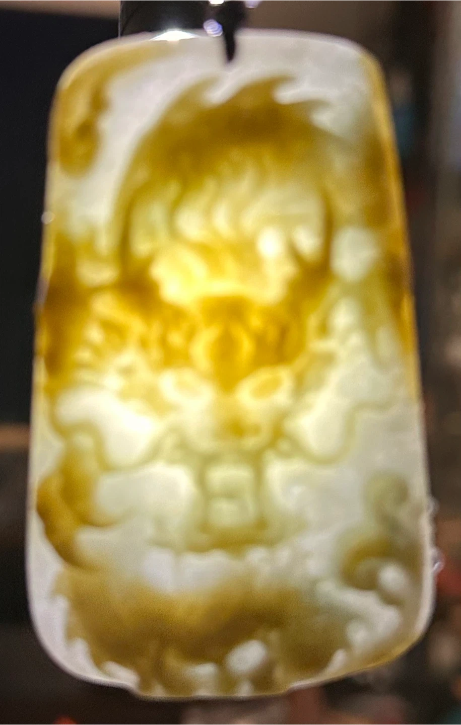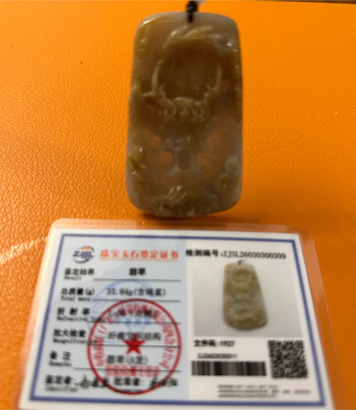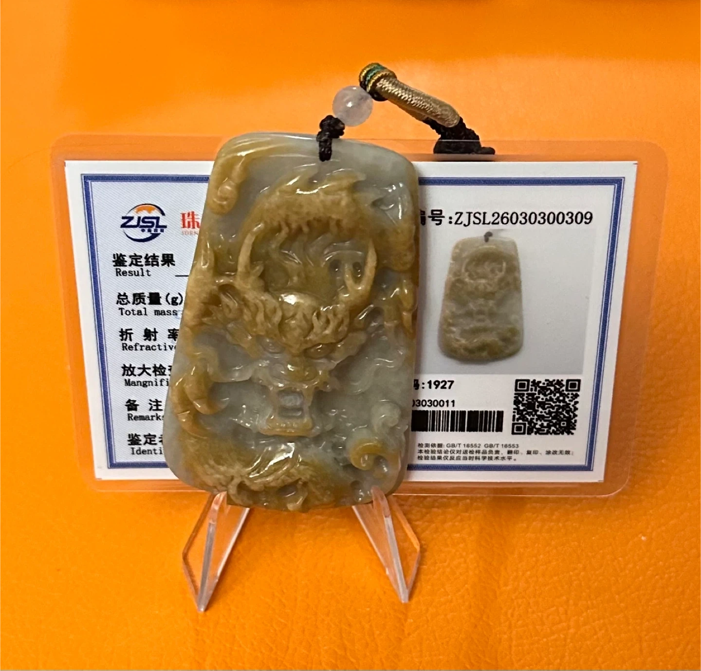 A carved RARE jade pendant featuring a dragon design. It weighs 32.84g and comes with authenticity certificate. This piece is suitable for those who appreciate intricate stone carvings.
