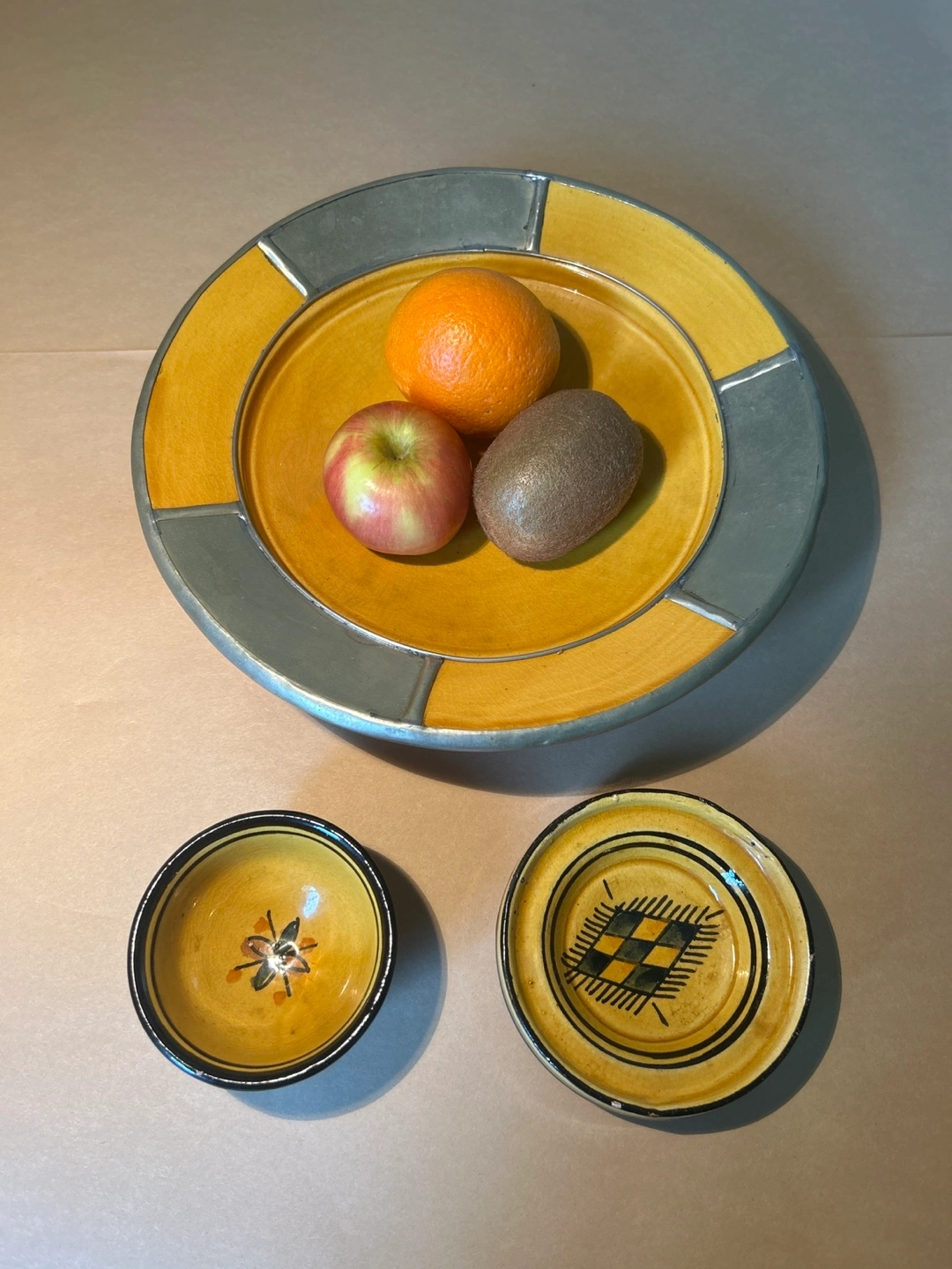 Hand-painted ceramic set. Includes a large bowl perfect for serving fruit or appetizers. Small saucer & bowl included. Unique designs. Beautiful addition to any kitchen.