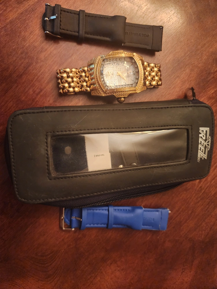 Gold tone watch with crystal accents. Includes two extra watch bands, one black and one blue. Watch comes in a Freeze branded carrying case.