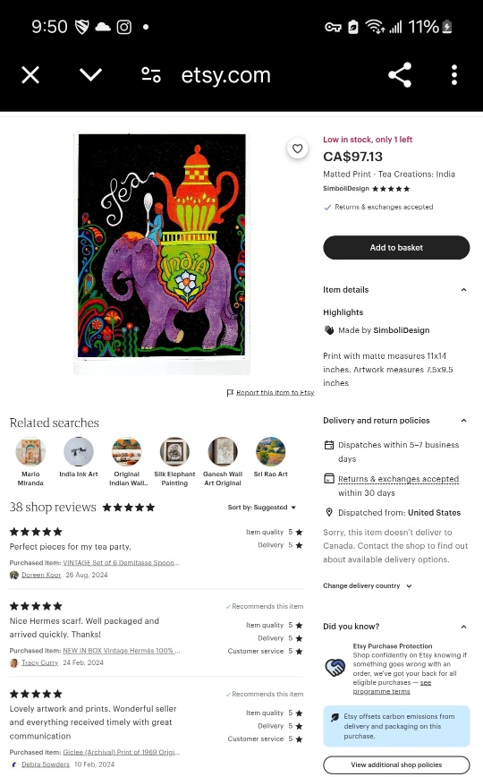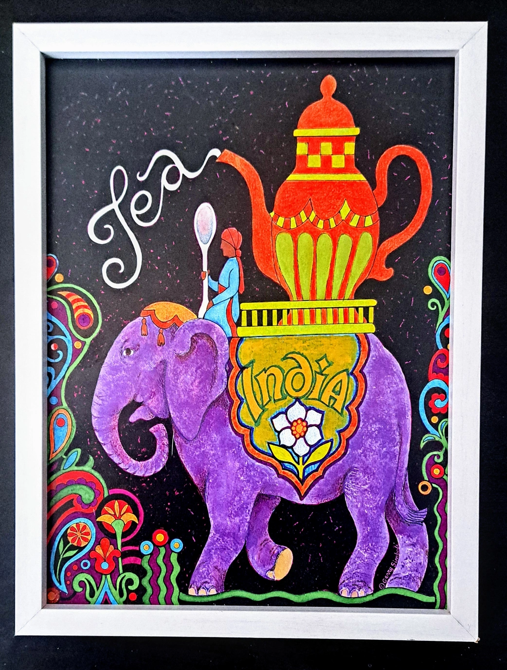 Unique framed artwork. Vibrant colours. Depicts an elephant carrying a large teapot, India. Person on elephant holding a spoon. Floral motifs. Black background. White frame. Picture is roughly 12inches tall.