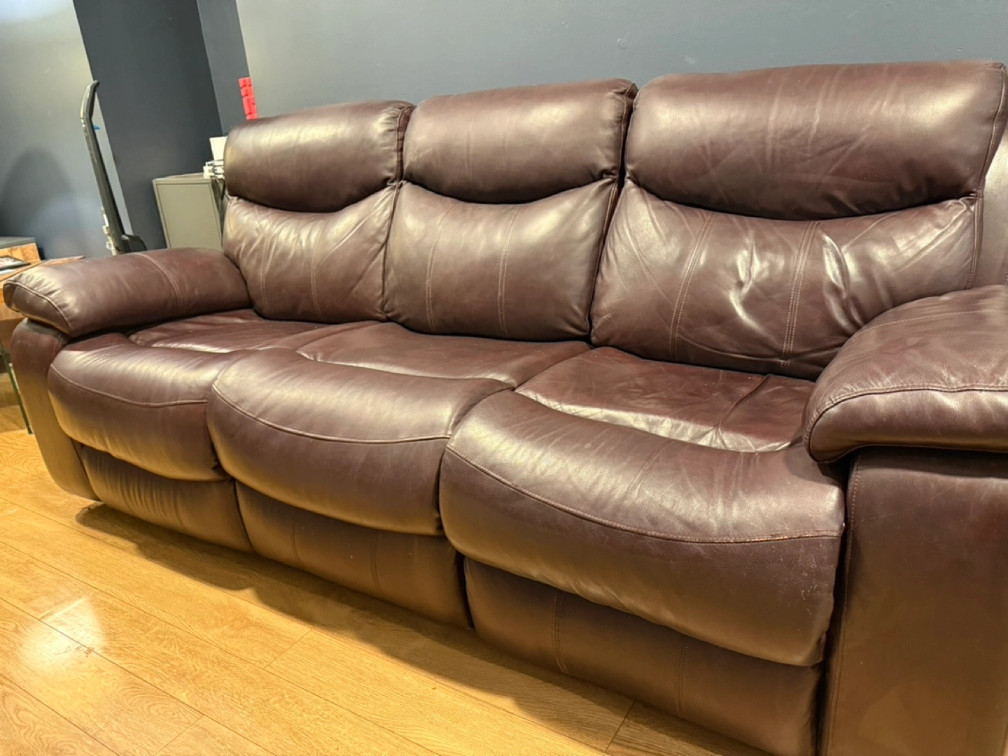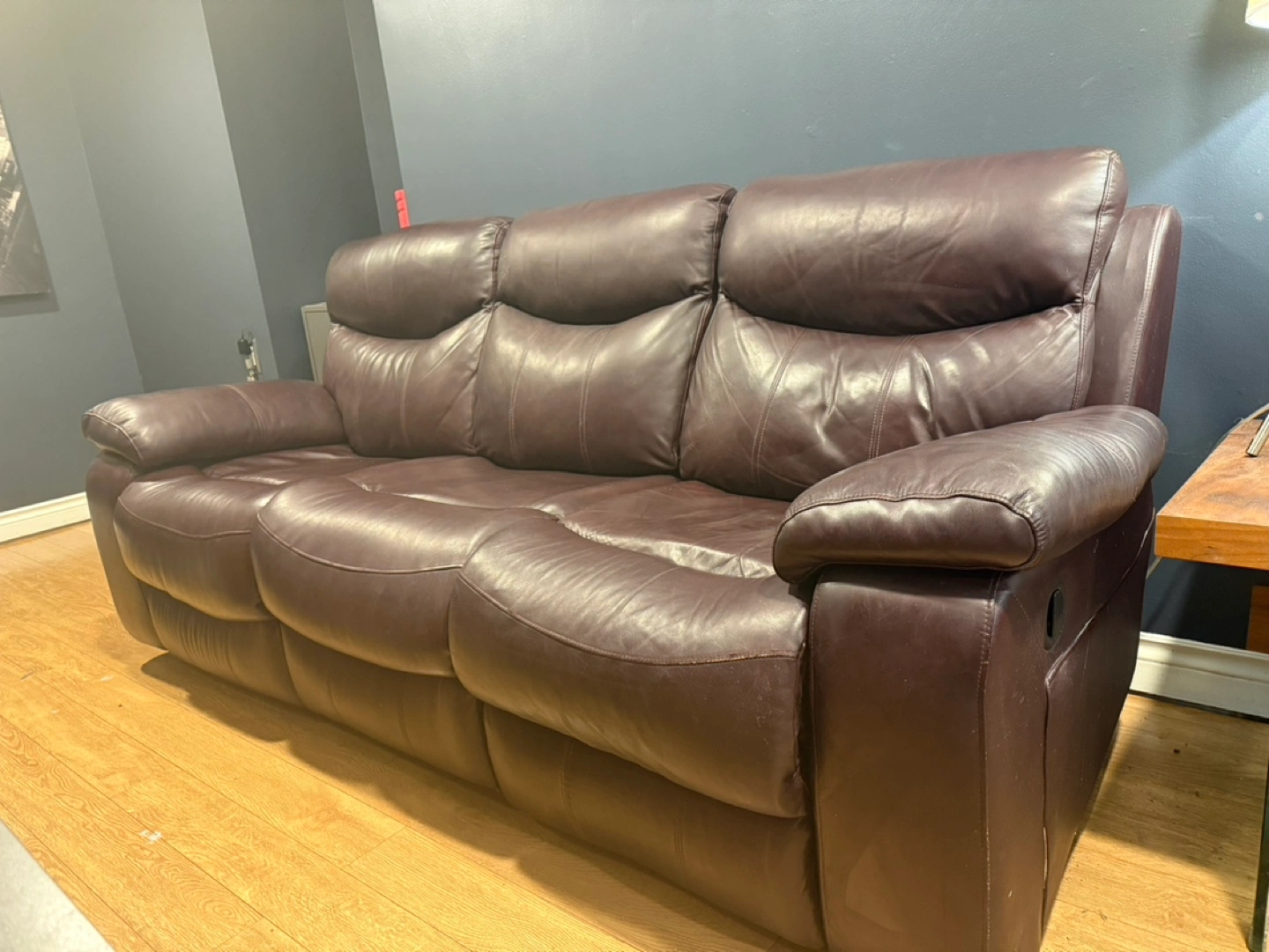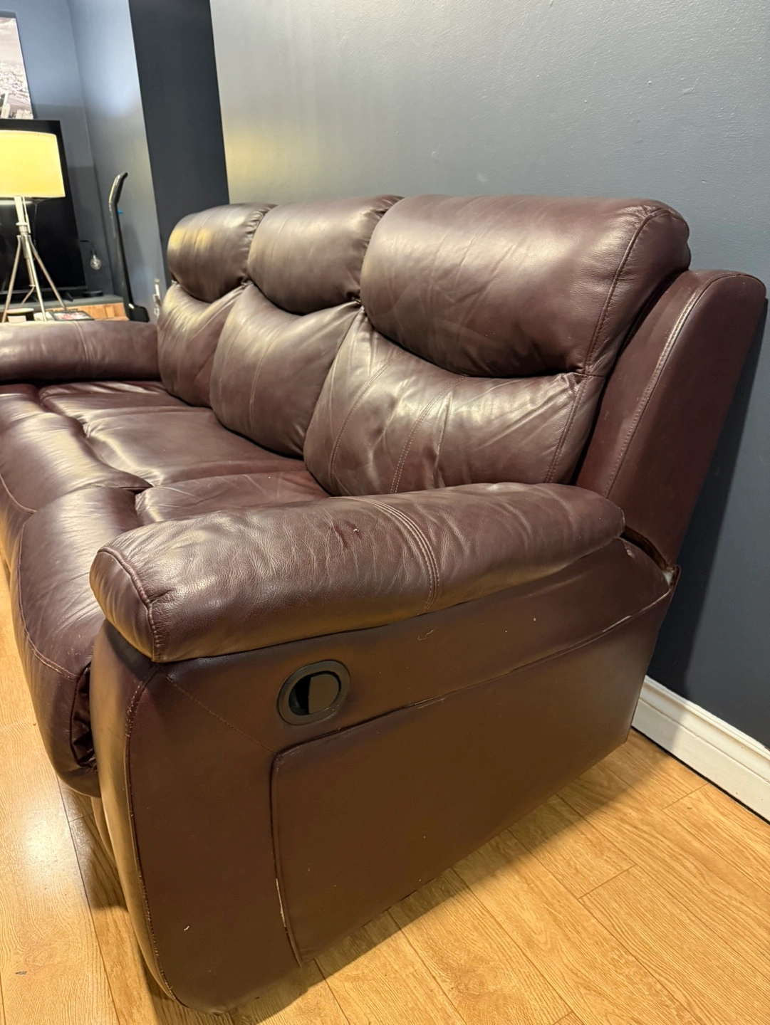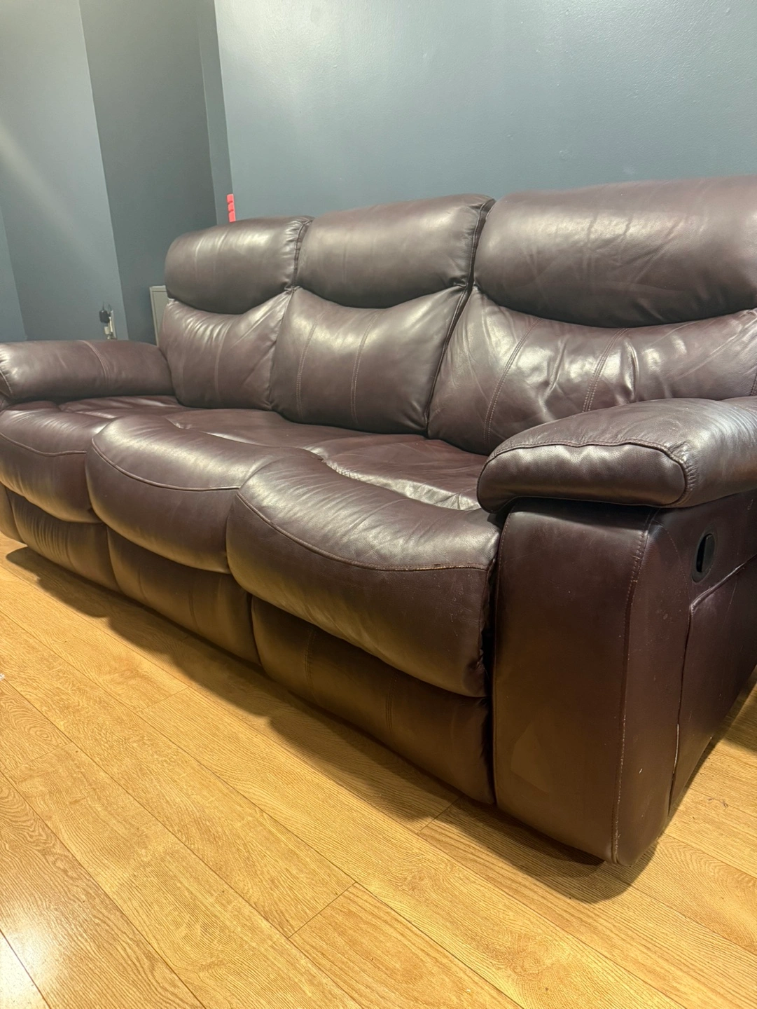 Three-seater reclining sofa. Brown leather upholstery. reclining mechanism. Gently used.