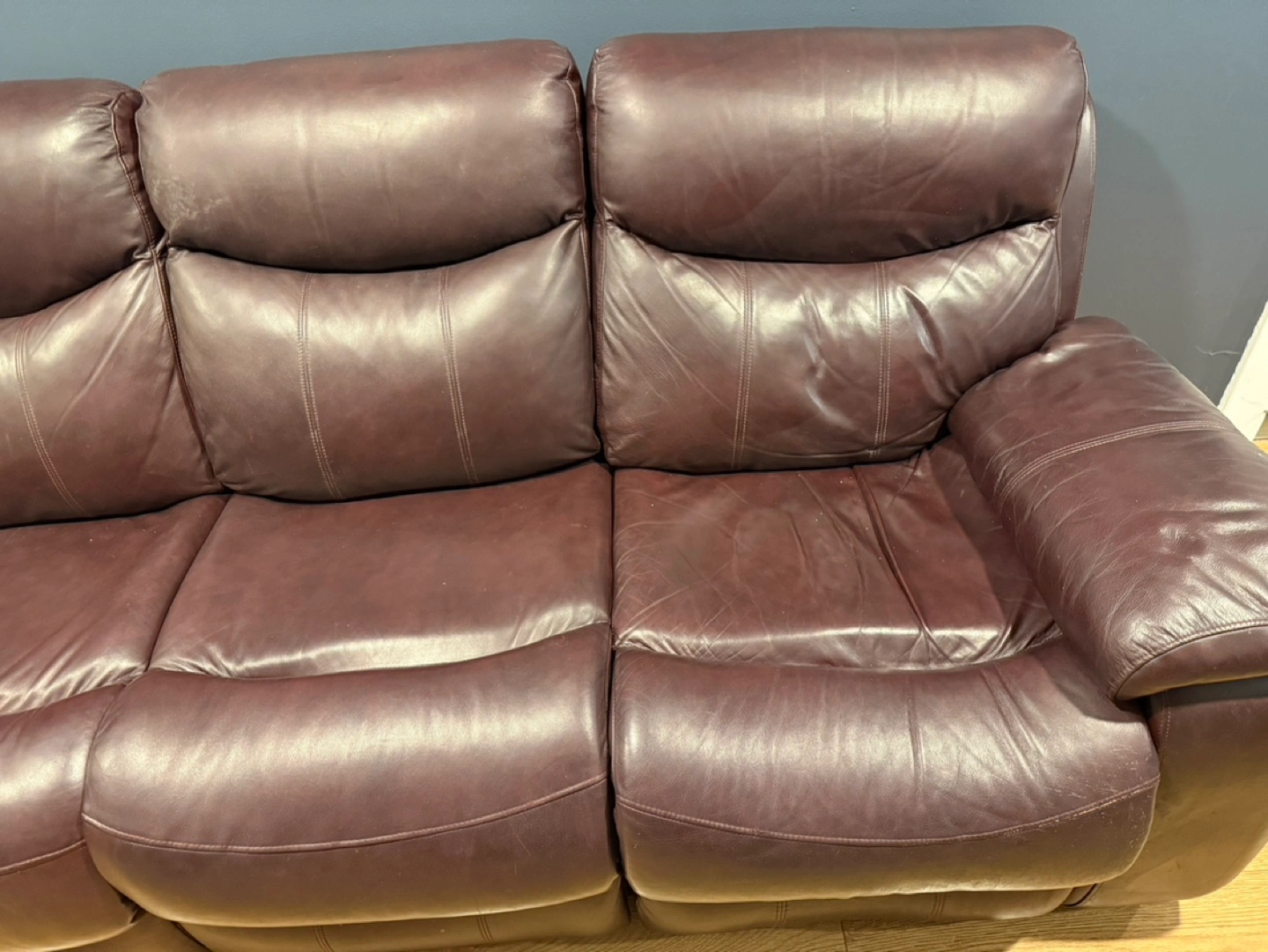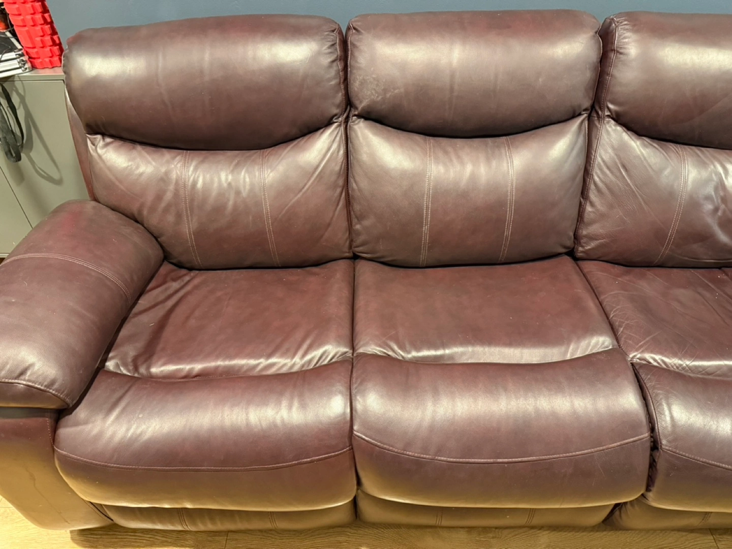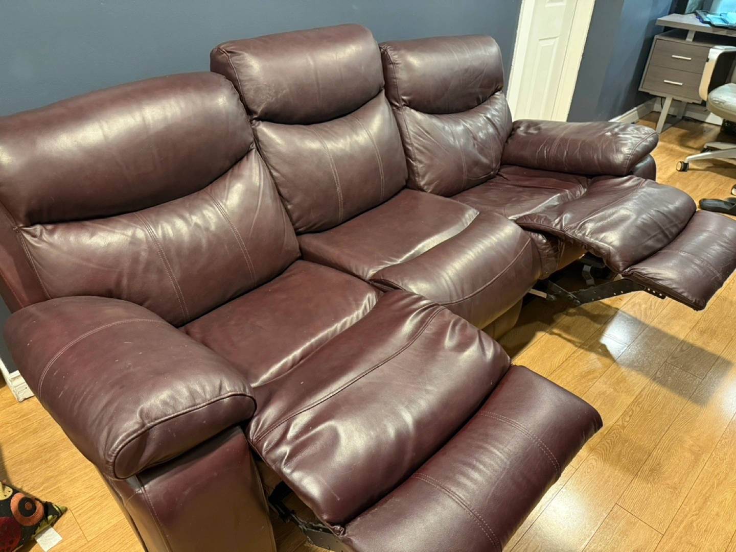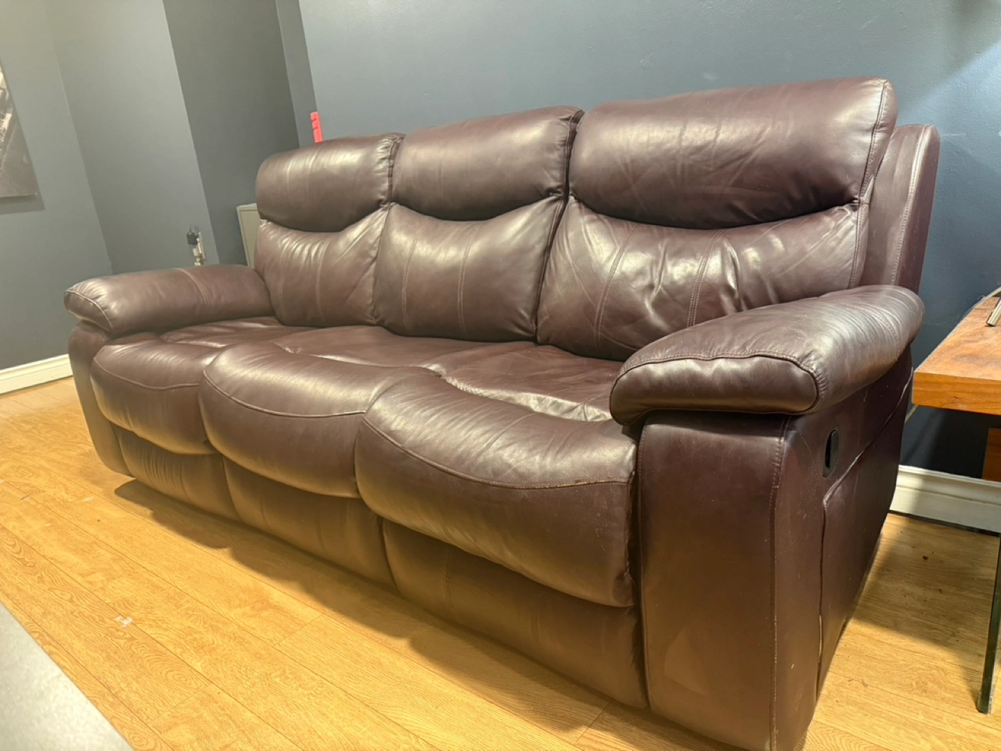 Three-seater reclining sofa. Brown leather upholstery. reclining mechanism. Gently used.
