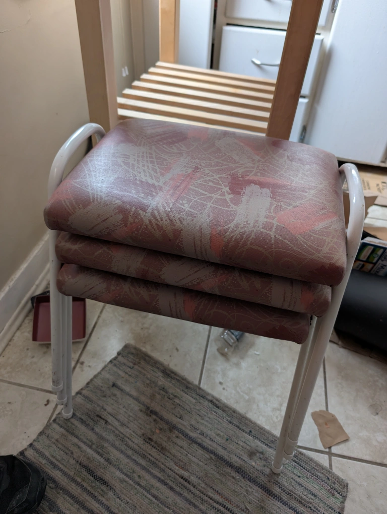Buy & SellStackable Stools - Set of ThreeStackable Stools - Set of Three$2Three stackable stools. White metal frame. Pink patterned fabric seats. Good for extra seating.ConditionGoodWHERE TO MEETCheck LocationView MapSELLERLuke GleadallCliff Bungalow261 review0 chats·1 favorites·27 viewsSEND CHAT TO SELLERHi Luke Gleadall! I’m interested in your listing.Hi Luke Gleadall! I’m interested in your listing.Get the Karrot app to chatSign In to chat