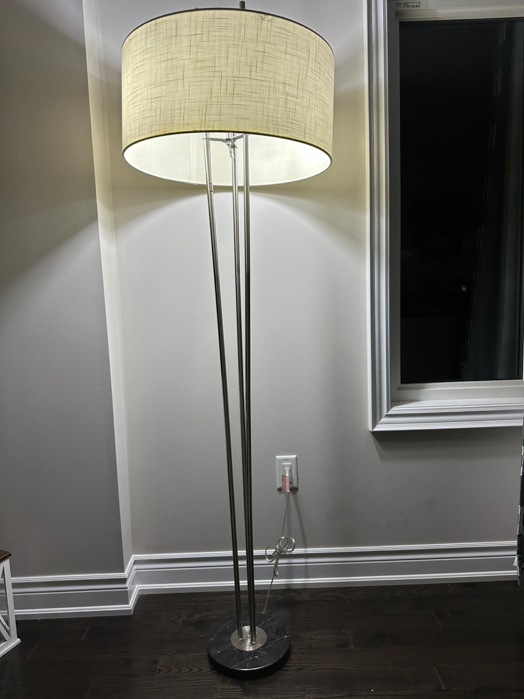 Used like new. Stylish floor lamp. Features a brushed nickel finish and a large cylindrical lampshade. Marble base. Great for living room or bedroom. Bought from urban barn $269 plus tax.