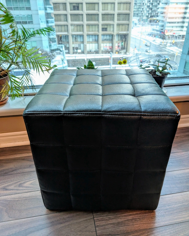 MOVEOUT SALE: Black faux leather ottoman. Square cube shape. Channel tufting detail. Sturdy and Perfect for extra seating or as a side table.
