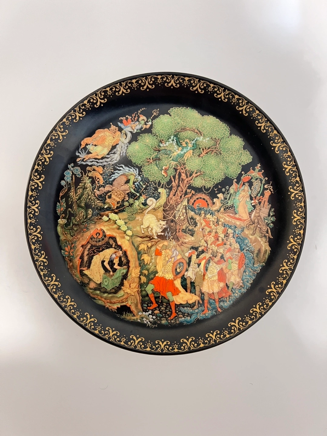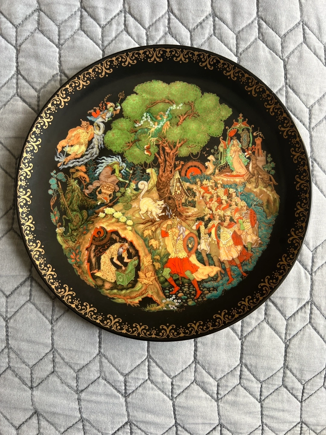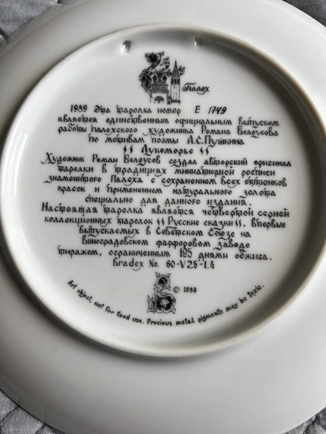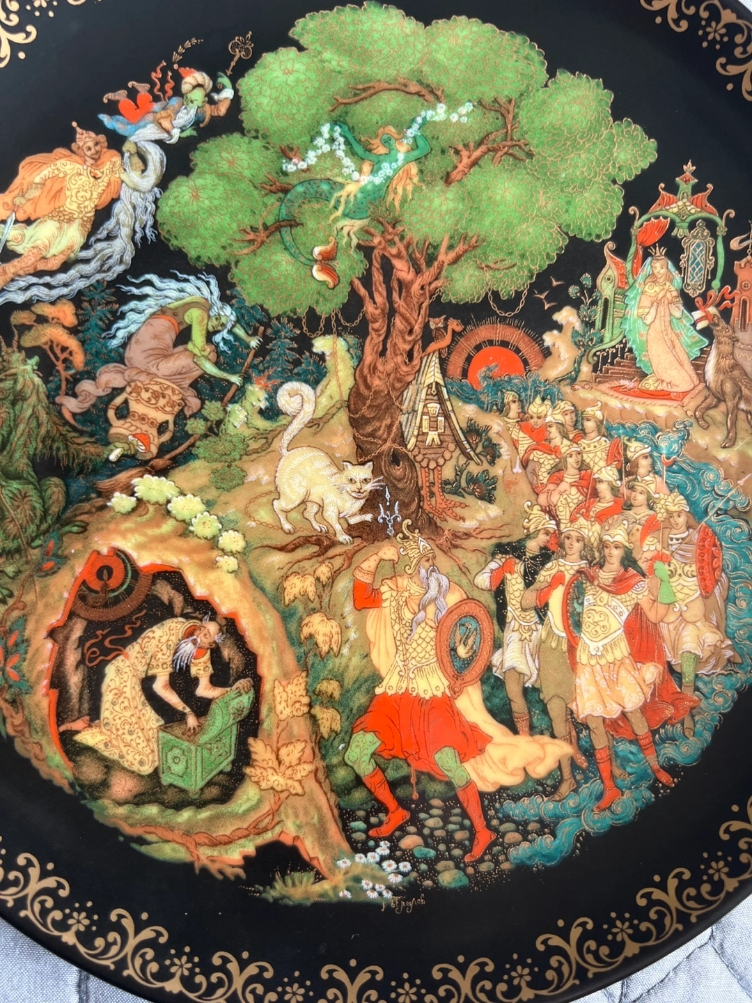 The plate illustrates the magical land of Lukomorye, a place of wonder and enchantment in Russian fairy tales.