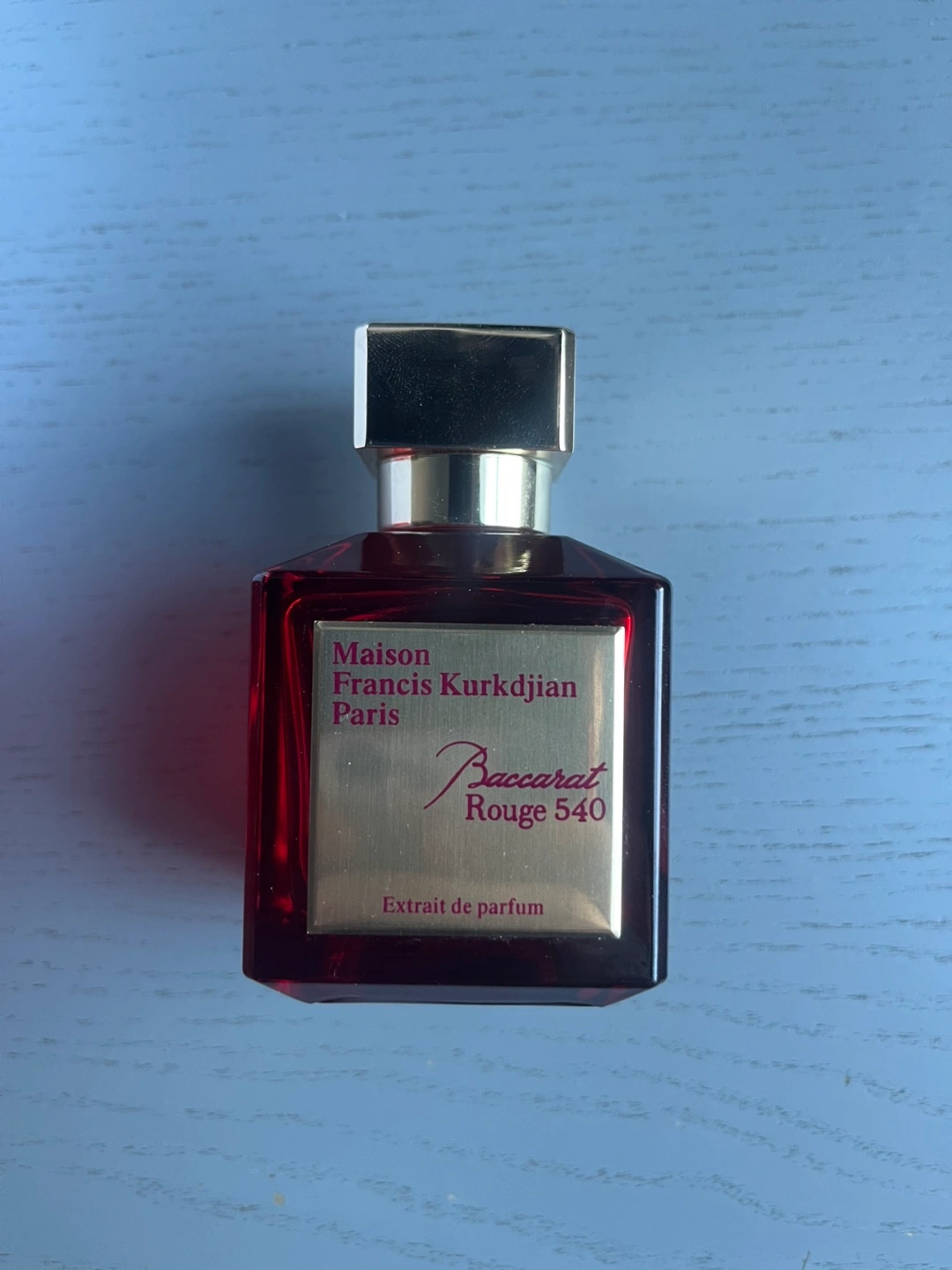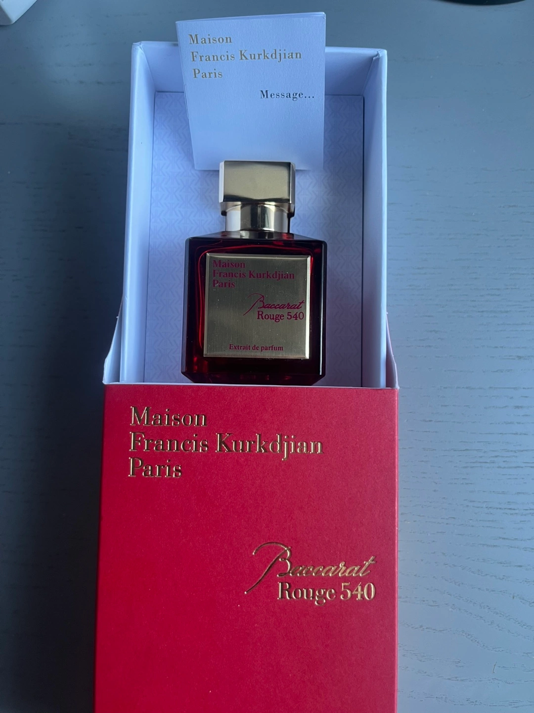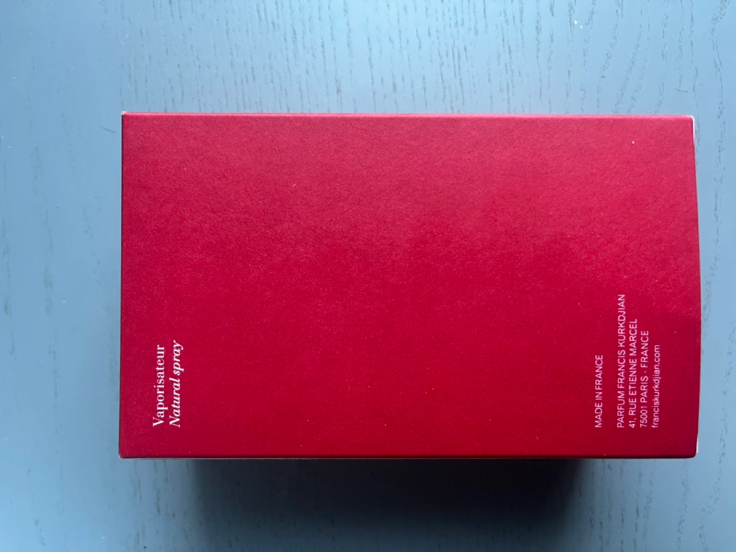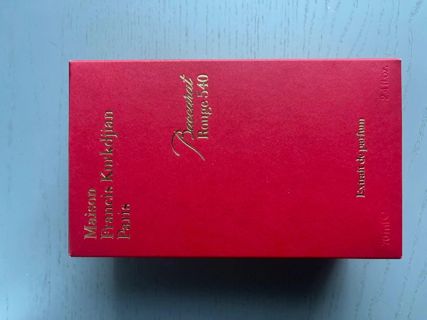 70ml Baccarat Rouge 540 Extrait de Parfum in box. Red bottle, gold cap. Maison Francis Kurkdjian Paris.