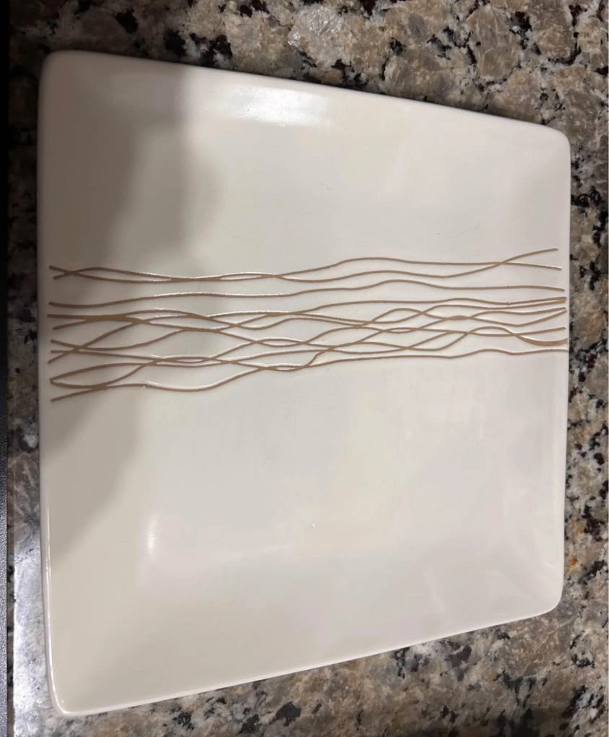 Set of square ceramic dinner plates. (11 pcs)Off-white colour with a subtle, elegant brown line design. Great for everyday use or special occasions. Perfect for a modern dining setting.