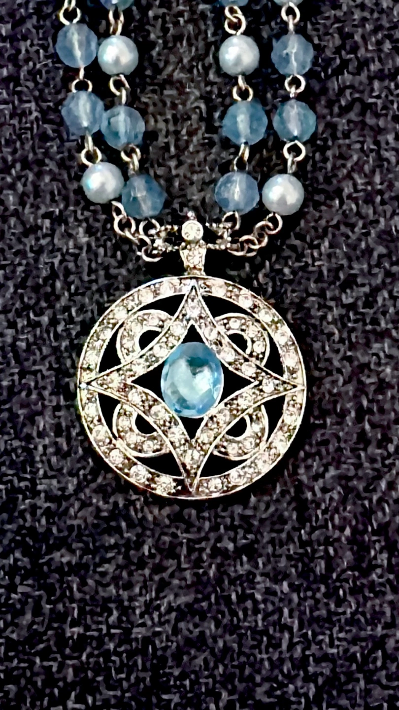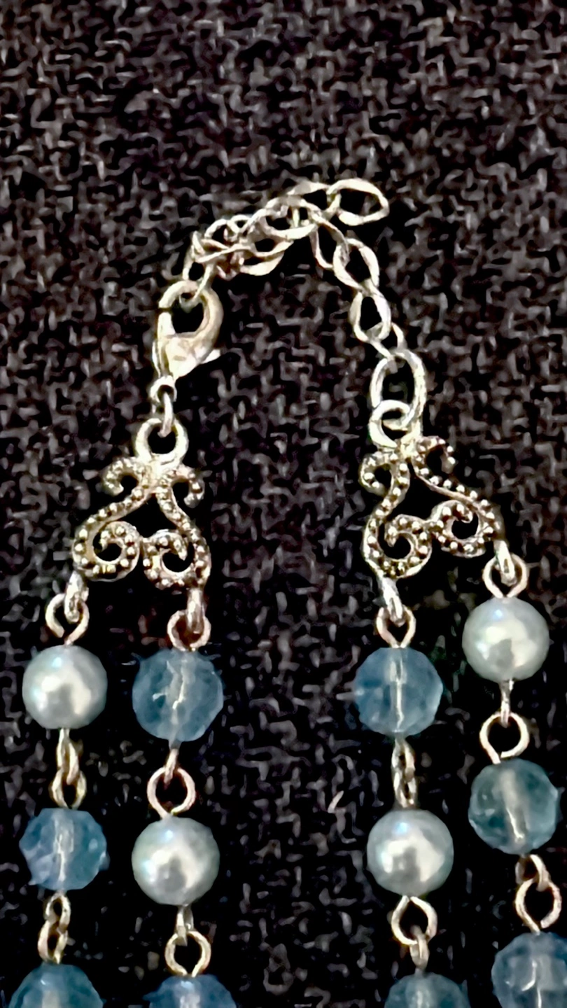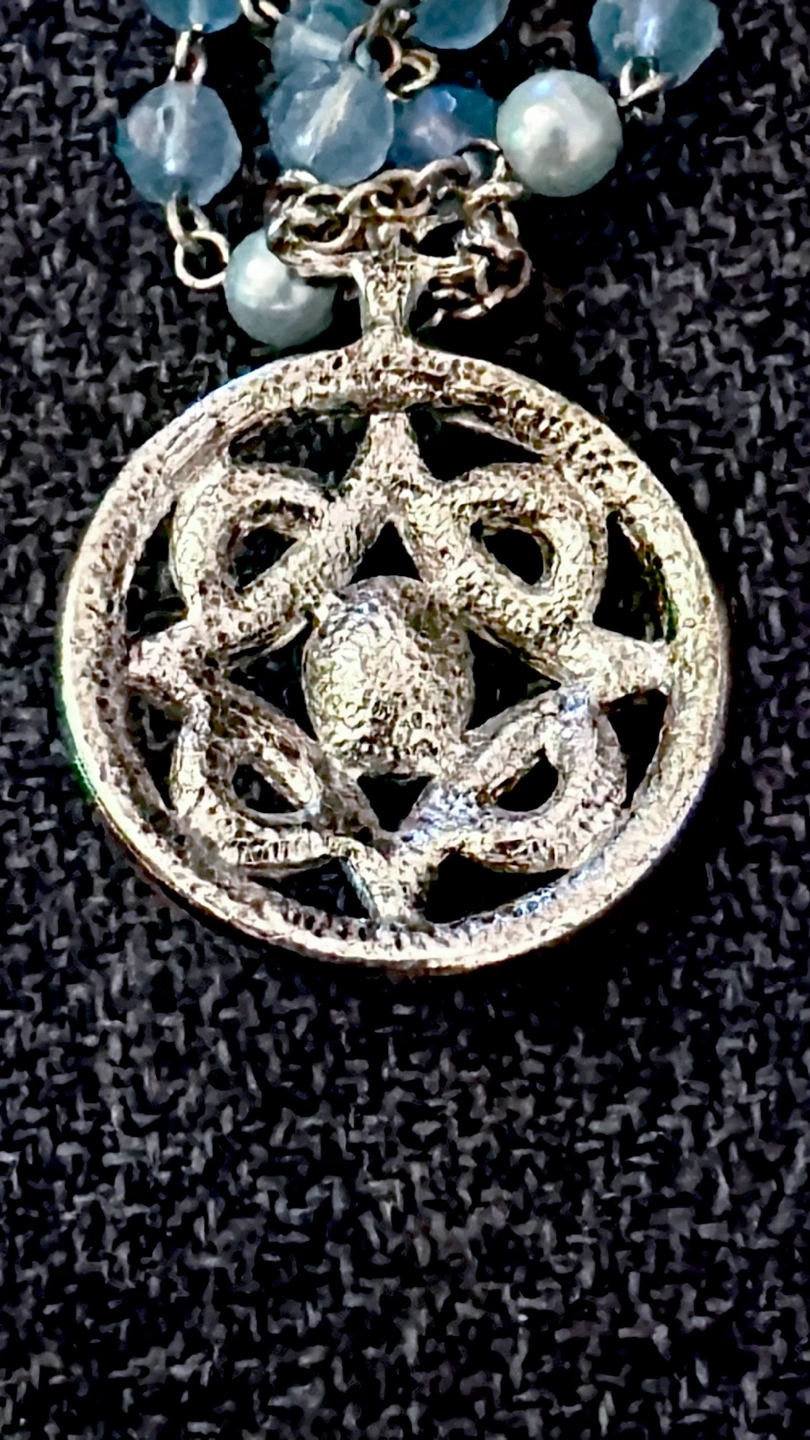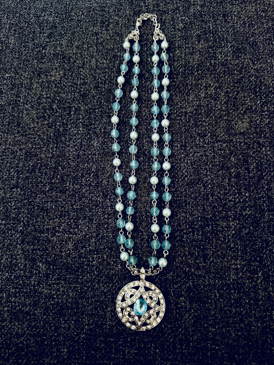 Beautiful necklace features light blue and pearly white beads. Silver-toned pendant with intricate design. Lobster clasp closure.